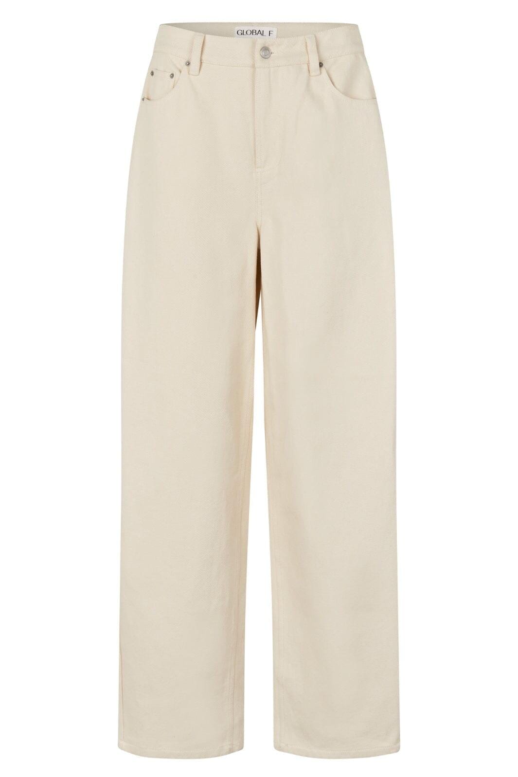Pitkät farkut Global Funkilta vaaleassa ecru-värissä. Farkuissa on suora malli ja ne on valmistettu puhtaasta puuvillasta, mikä tarjoaa hyvää liikkuvuutta arjessa.