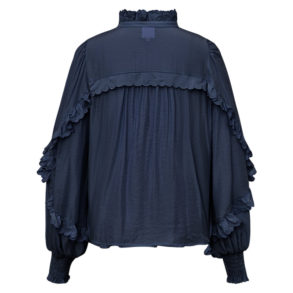 Valkoinen paita Gossialta, jossa on rypytetty kaula-aukko ja nappikiinnitys edessä. Paidassa on brodeerattuja pitsiyksityiskohtia rinnassa ja hihoissa sekä rypytettyjä yksityiskohtia, jotka luovat aaltoilevan vaikutuksen.