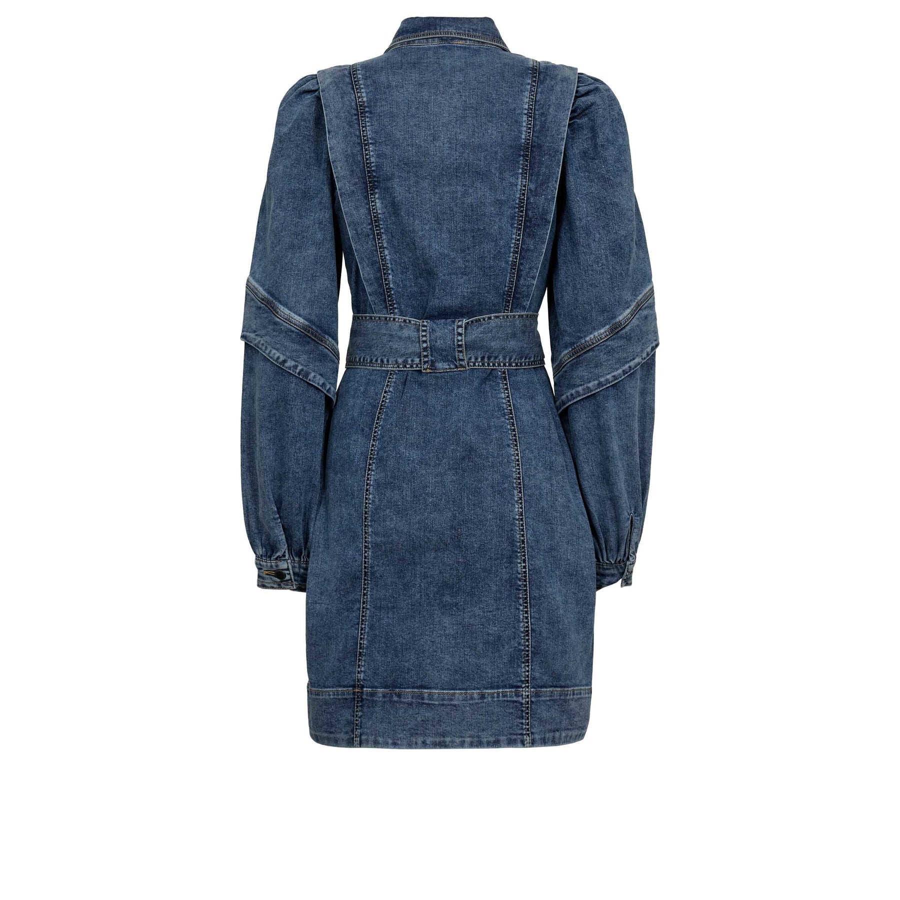 Gossian farkkumekko keskisinisessä denimissä. Mekossa on paitakaulus, pitkät hihat ja pituus reiteen. Siinä on koristeelliset tikkaukset ja solmittava vyö.