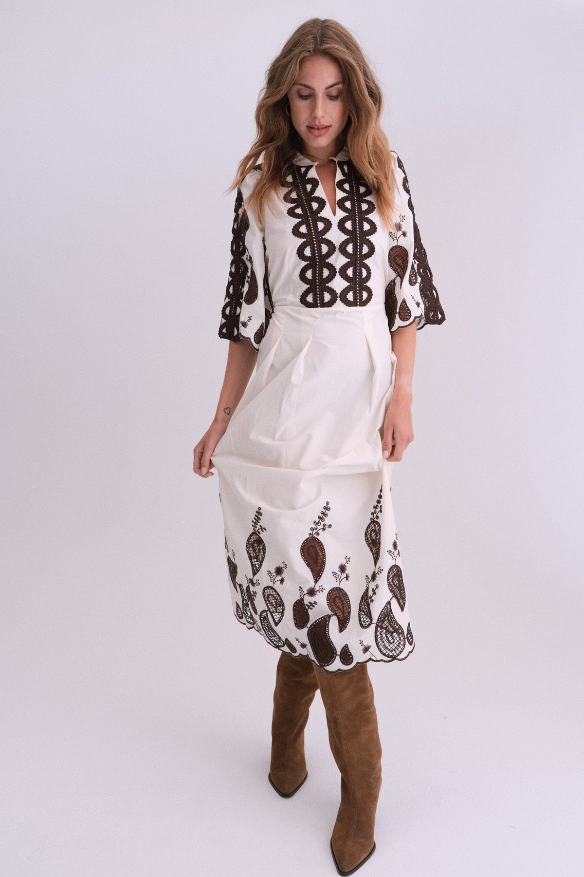Cremevärinen mekko Gossialta, jossa on ruskeaa brodeerausta ja pitsiyksityiskohtia. Mekossa on 3/4-hihat ja se ulottuu polven keskelle. Pyöreä pääntie ja kukkainen paisleymuotoilu antavat mekolle rustiikkisen ilmeen.