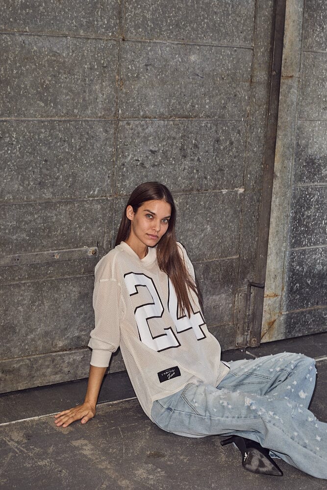 Pitkähihaine urheilutoppi Haute L'Amitié -merkiltä helmenvärisestä mesh-materiaalista. Suuri 24-numeropainatus edessä ja koristeelliset saumat antavat topille sporttisen ilmeen.