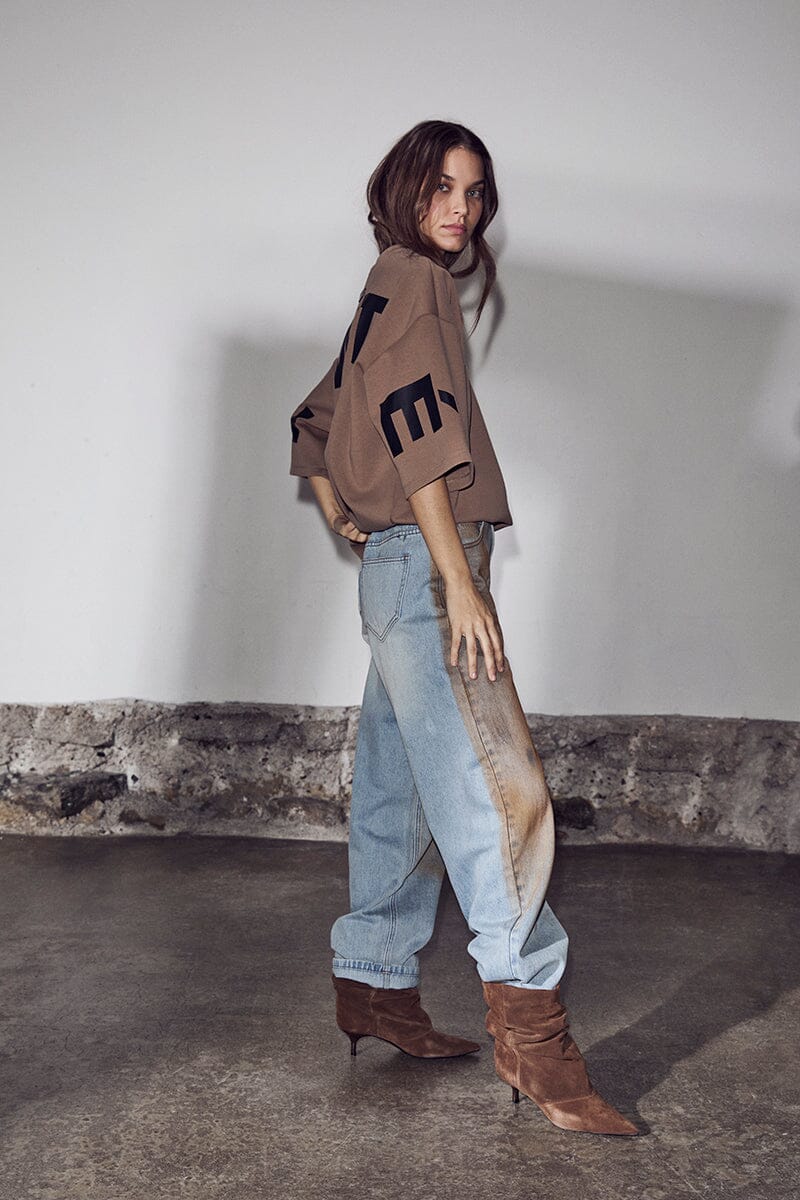 Haute L'Amitién farkut, joissa on bleach dirt -denimdesign sinisen ja ruskean sävyissä. Vintage-pesu antaa farkuille retroilmeen.