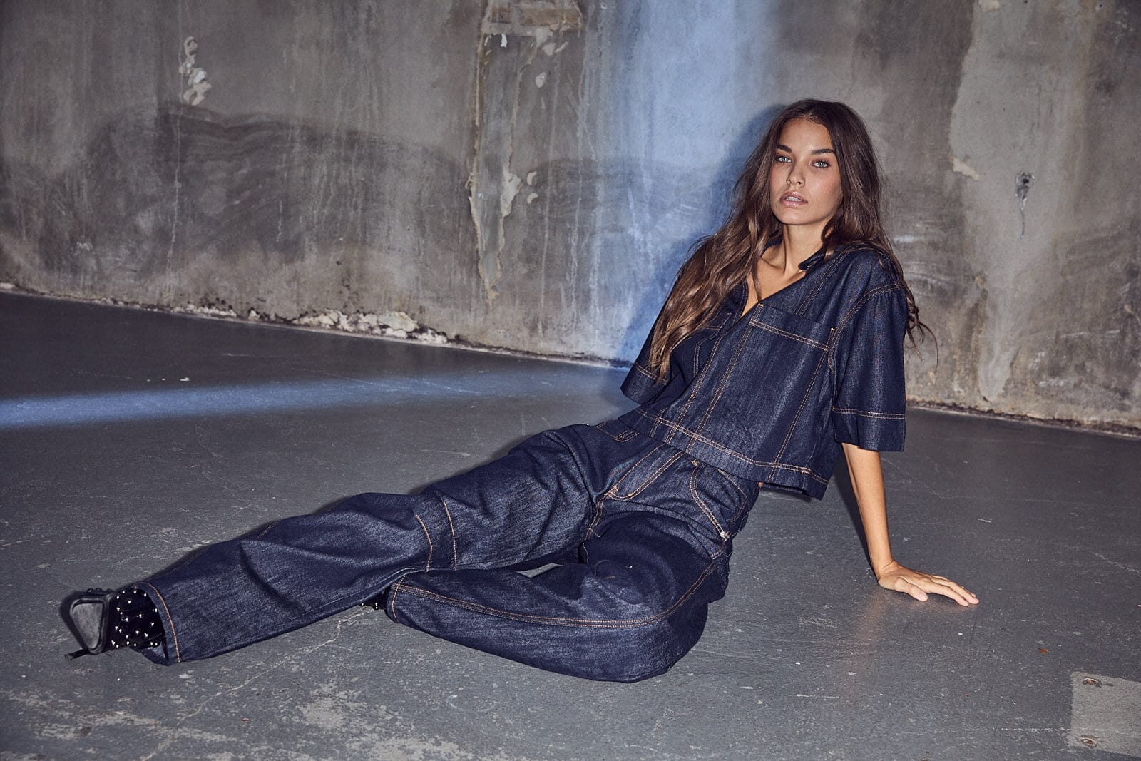 Denimtoppi Haute L'Amitié -merkiltä raakaa, tummansinistä denimiä. Topissa on syvä V-pääntie paitakauluksella ja näkyvät kontrastiompeleet.