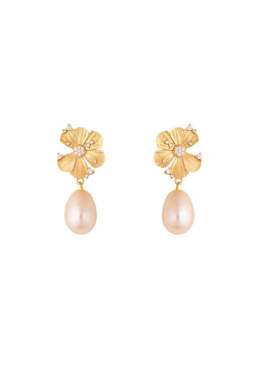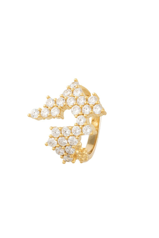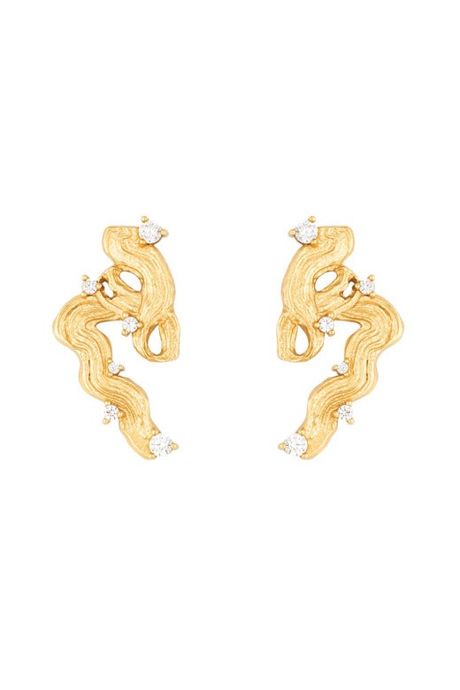 Kultaiset korvakorut House Of Vincentilta aaltoilevalla muotoilulla. Korvakoruissa on rakenteellinen pinta ja pieniä kirkkaita kiviä jakautuneena kiertyvän kuvion varrelle.