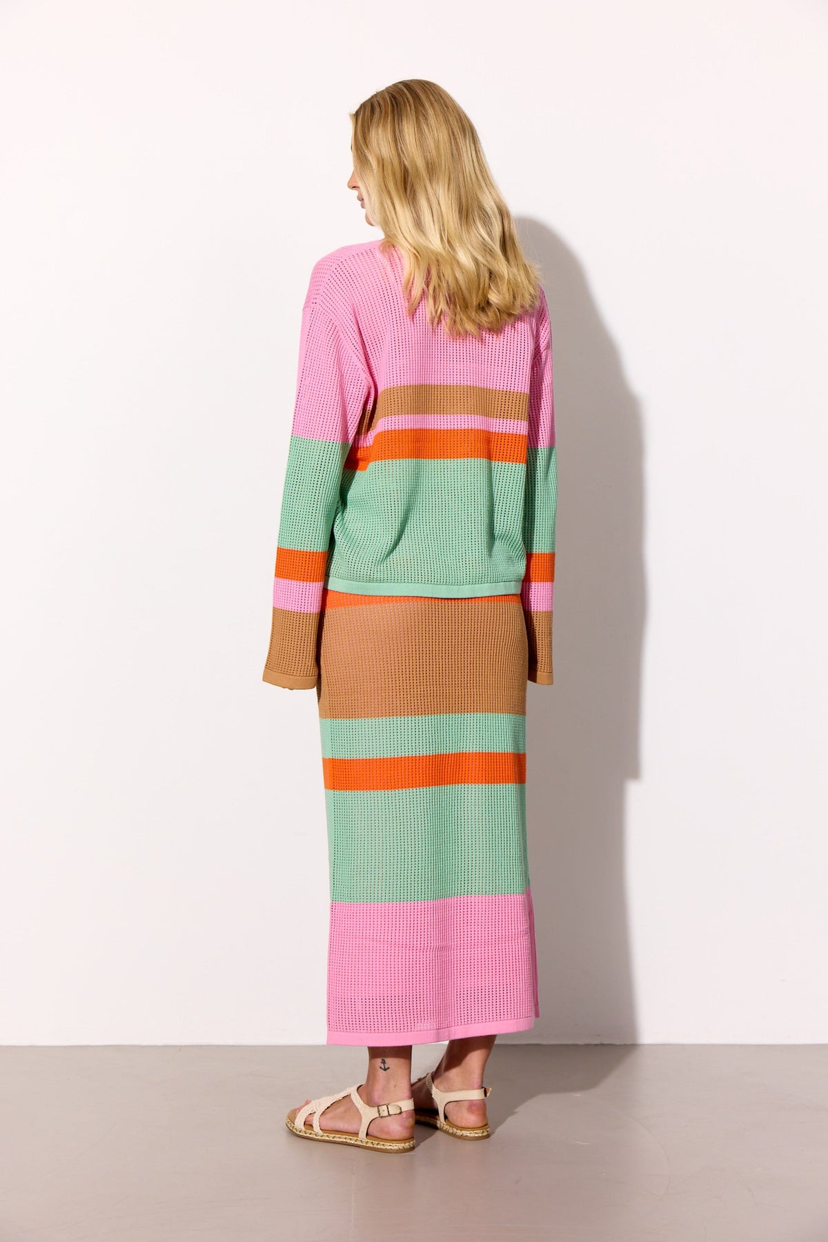 Hunkøn-pusero, jossa on pinkkejä, mintunvihreitä, oransseja ja ruskeita raitoja. Siinä on verkkoneulottu rakenne ja väljä istuvuus.