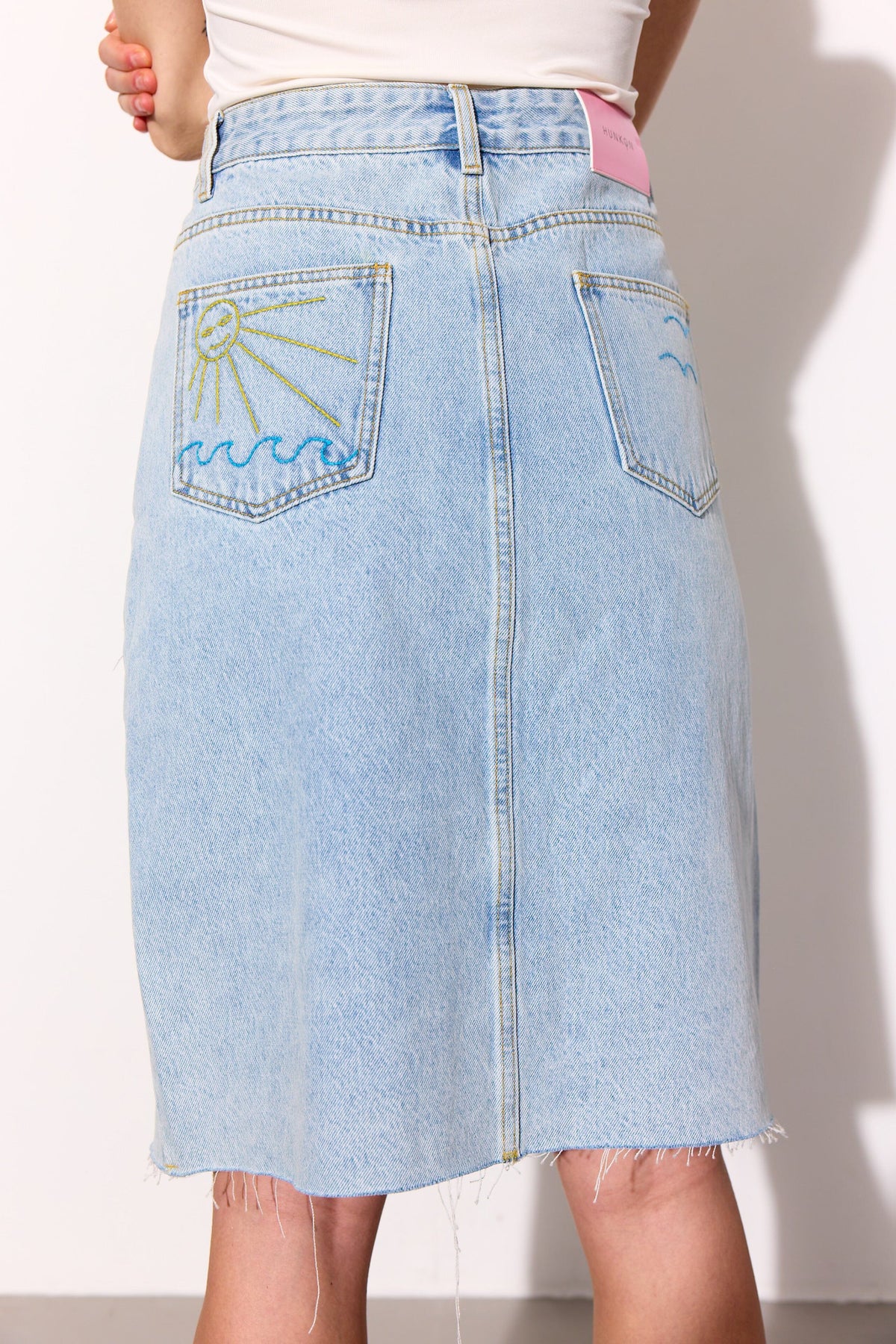Hunkøn-farkkuhame vaaleansinisestä denimistä. Hameessa on revityt yksityiskohdat edessä ja kirjailut takataskuissa aurinko- ja aaltokuviolla.