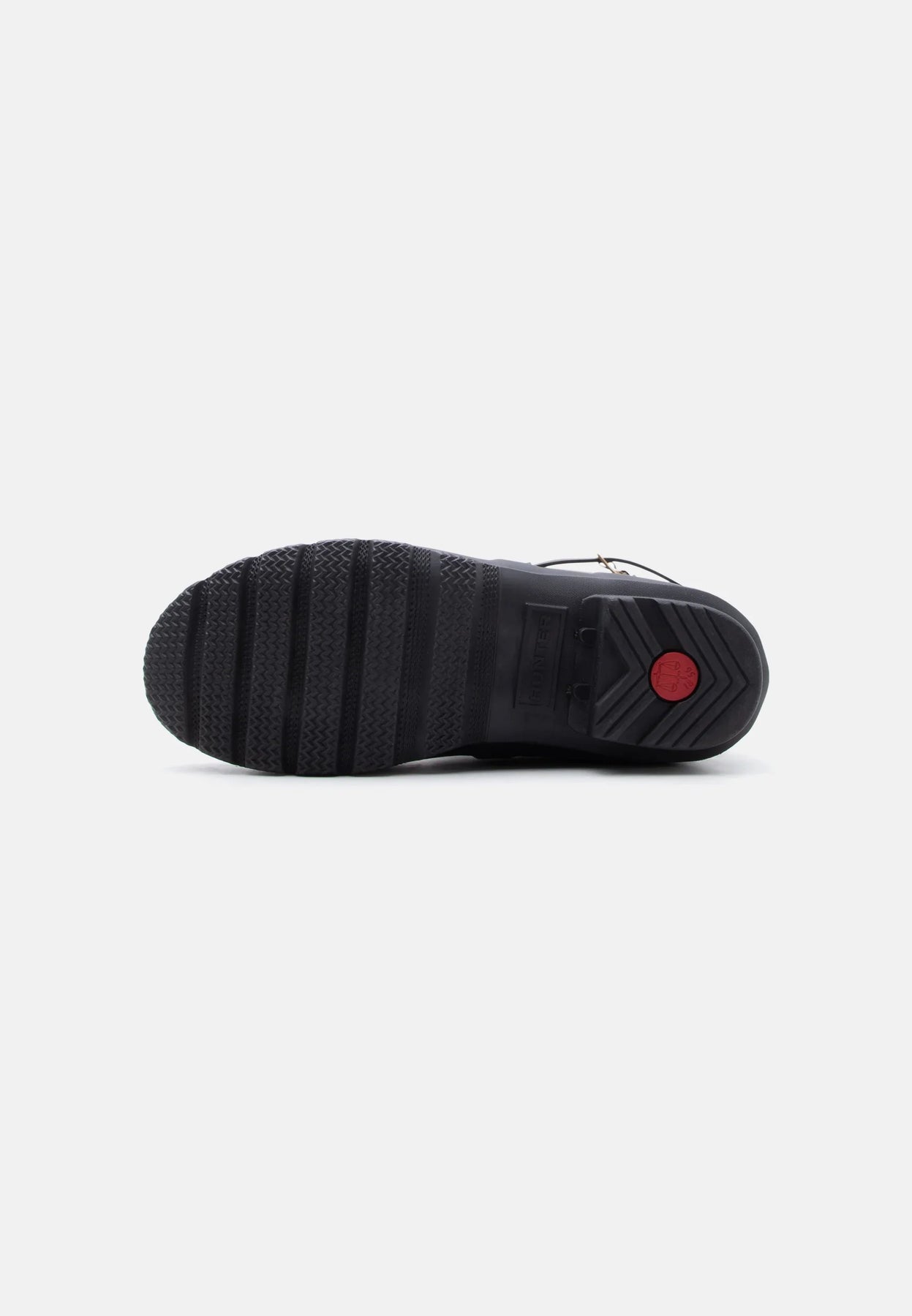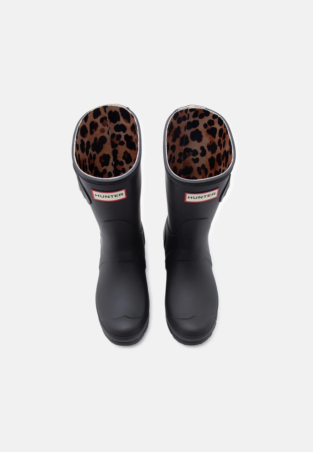 Mustat Hunter-kumisaappaat, joissa on leopardikuvioinen remmi takana. Saappaat on valmistettu 100 % kumista ja niissä on solkikiinnitys.