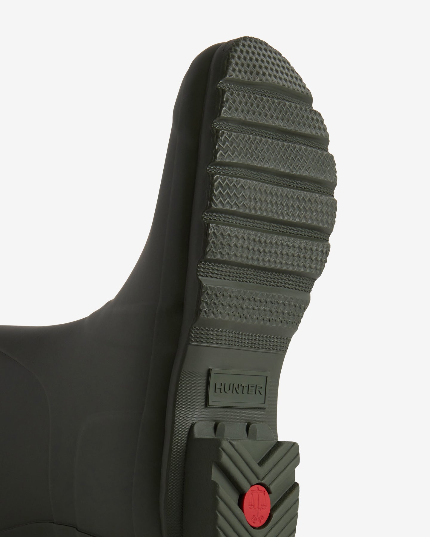 Korkeat kumisaappaat Hunterilta, valmistettu 100 % kumista tumman oliivin sävyssä. Saappaissa on blokki-korko ja pyöreä kärki.