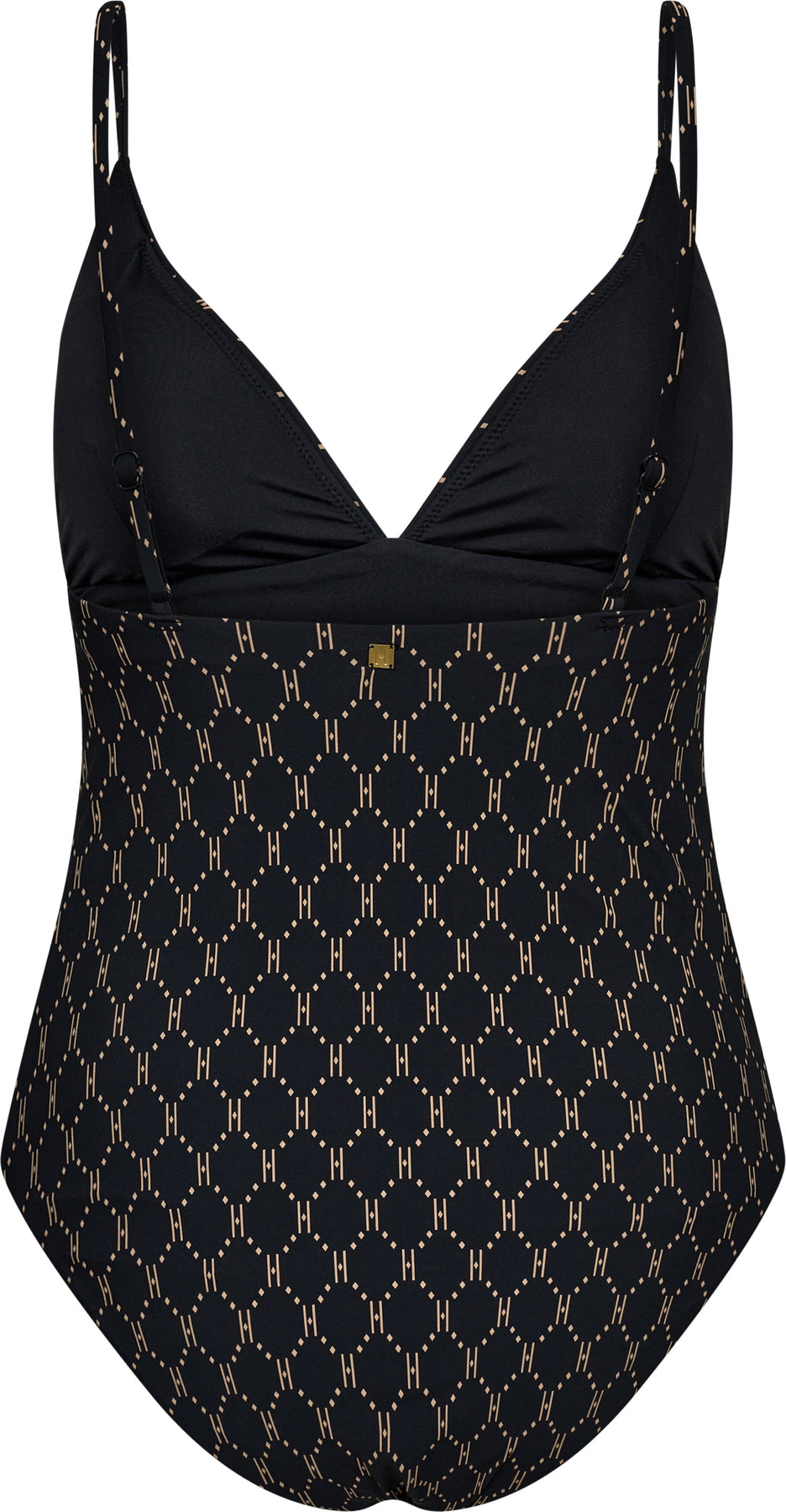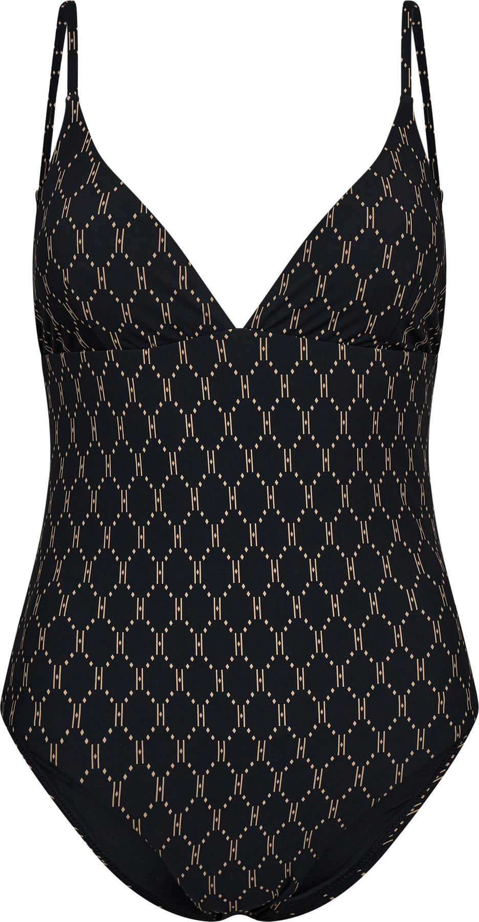 Musta Hype The Detail -uimapuku, jossa on geometrinen, toisiinsa kietoutuvista muodoista koostuva kuvio. Uimapuvussa on ohuet olkaimet ja V-pääntie.