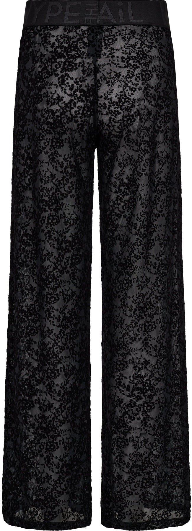 Mustat pitsihousut Hype The Detail -merkiltä, joissa on kukkakuvio koko kankaassa. Housuissa on leveälahkeinen malli ja joustava vyötärö.