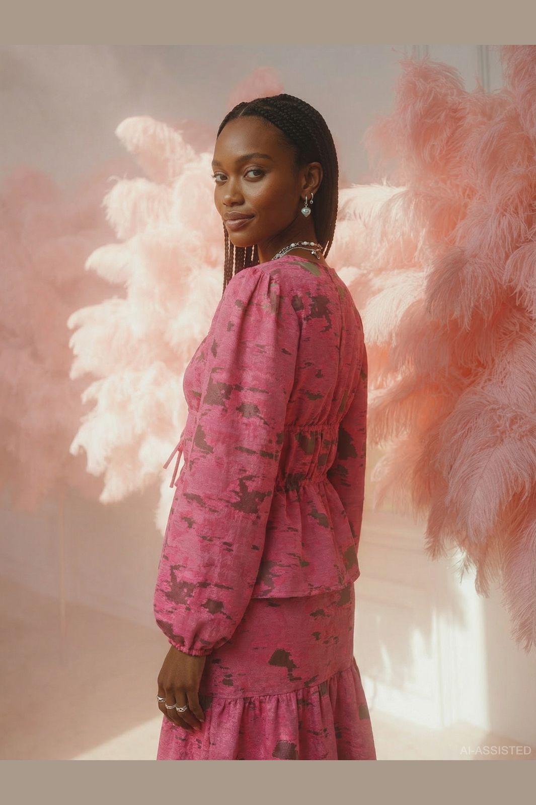 Vaaleanpunainen Hypedrop-paita, jossa on maastokuvioinnista inspiroitu burnout-tekniikalla tehty kuvio. Paidassa on V-pääntie ja pitkät hihat, joissa on joustavat hihansuut.