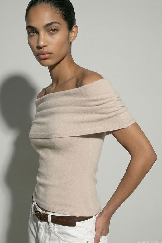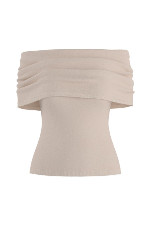 Neulepaita Hypedropilta vaaleanbeigessä sävyssä. Topissa on off-shoulder-pääntie ja vartaloa myötäilevä istuvuus ribiyksityiskohdilla.