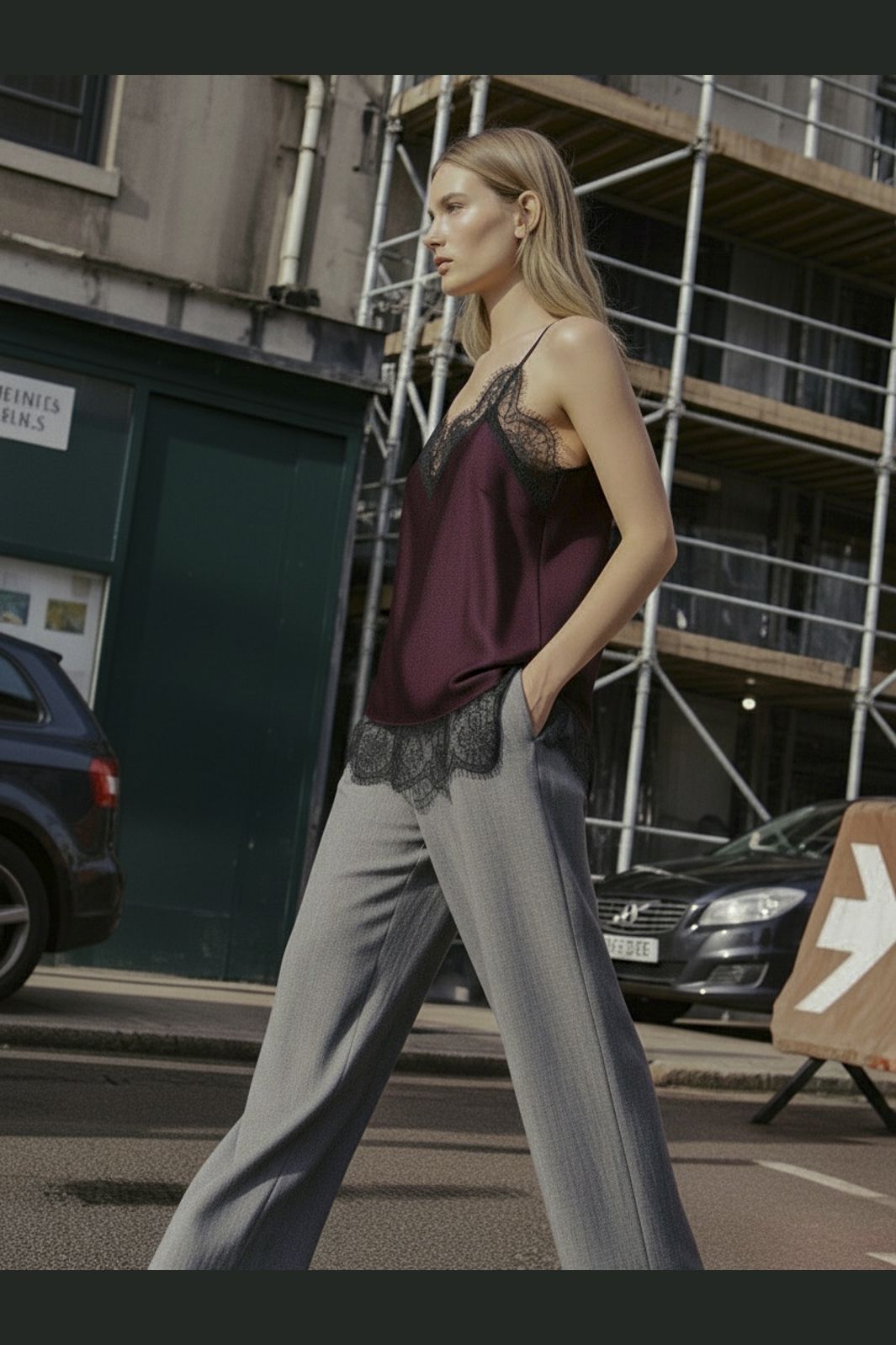 Satiinitoppi Hypedropilta syvässä violetissa. Topissa on V-pääntie mustalla pitsireunalla ja ohuilla olkaimilla. Rentoa istuvuus tarjoaa hyvää liikkuvuutta.