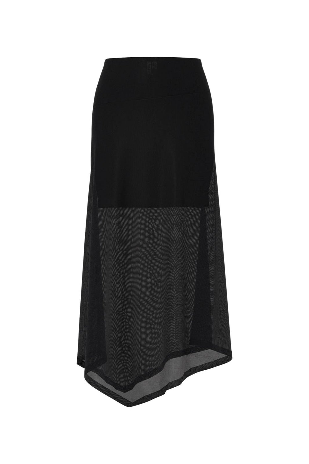Musta verkkohame Hypedropilta epäsymmetrisellä reunalla. Pitkä hame on korkeavyötäröinen ja läpinäkyvä muotoilu luo syvyyttä ja kontrastia kankaaseen.