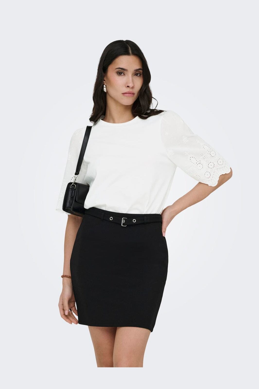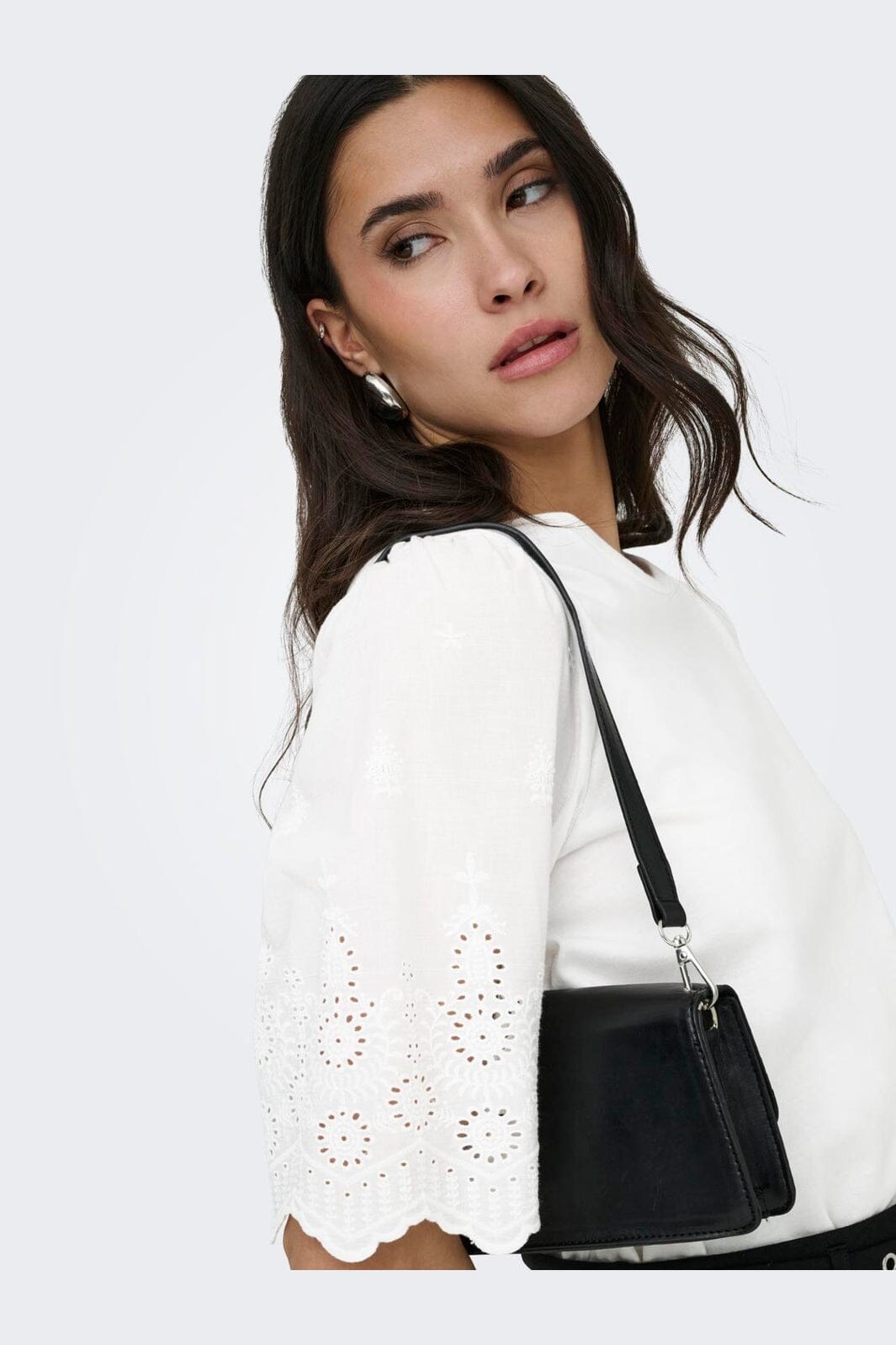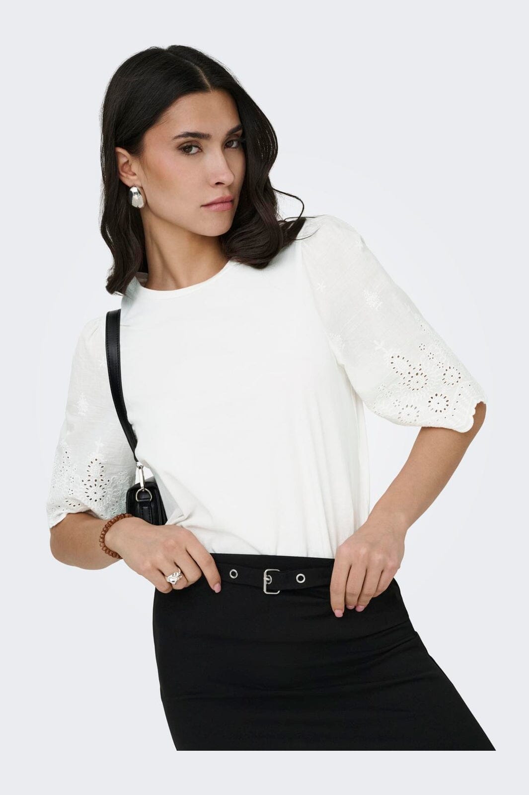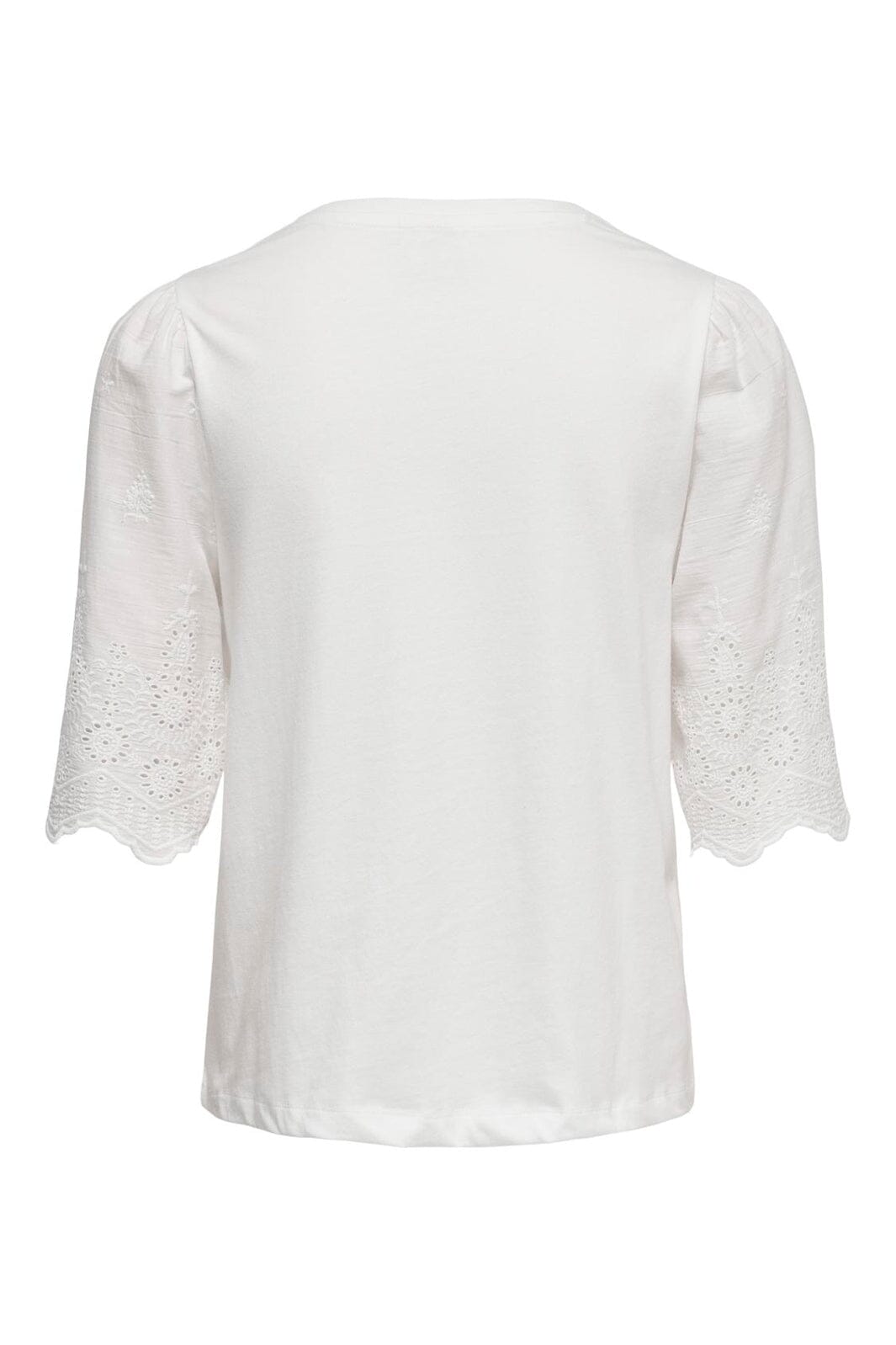 Valkoinen JDY-toppi, valmistettu luomupuuvillasta. Topissa on lyhyet hihat brodeeratuilla yksityiskohdilla ja pyöreä pääntie.