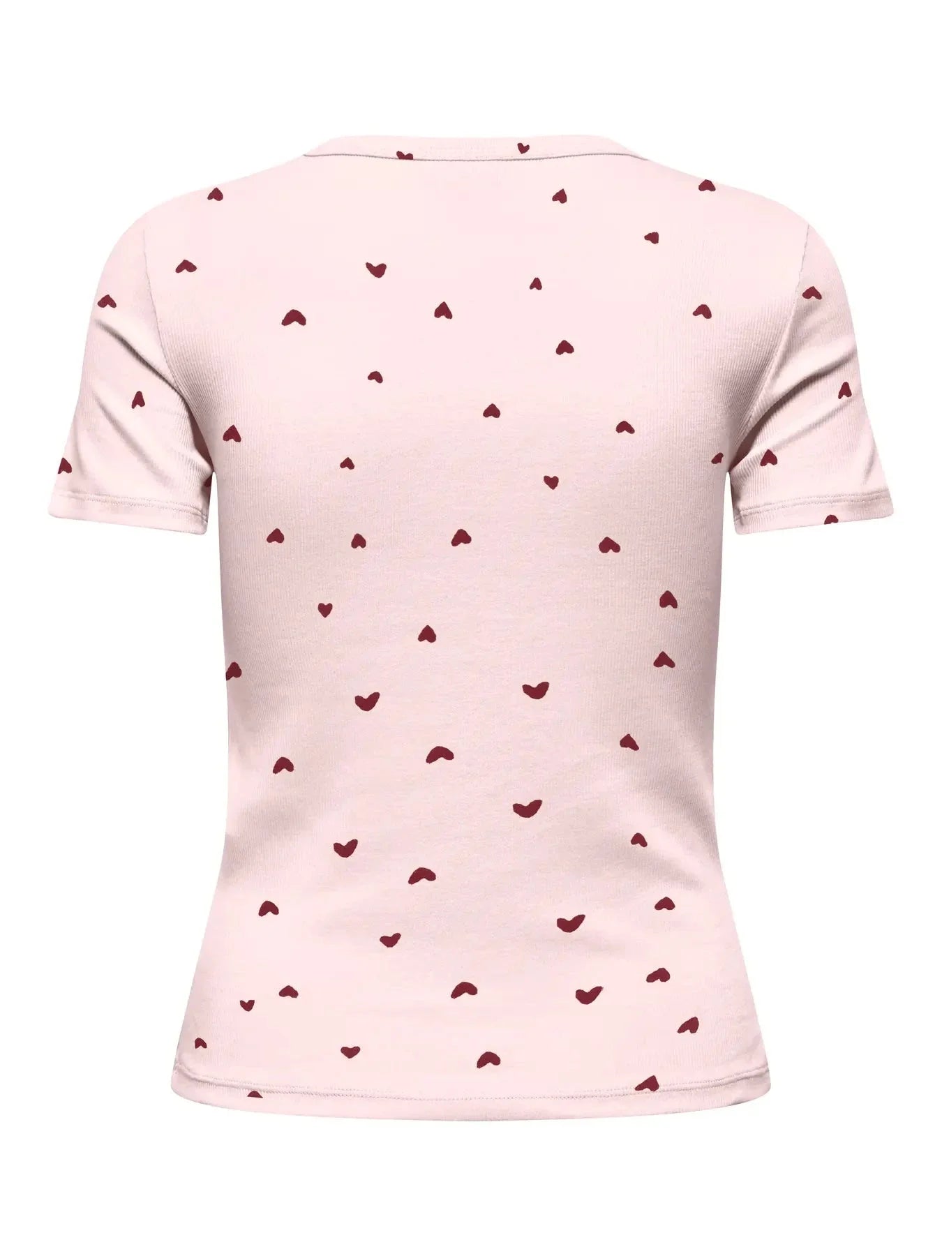 Vaaleanpunainen JDY T-paita, jossa on pieniä punaisia sydämiä kauttaaltaan kankaassa. Topissa on pyöreä pääntie ja lyhyet hihat.