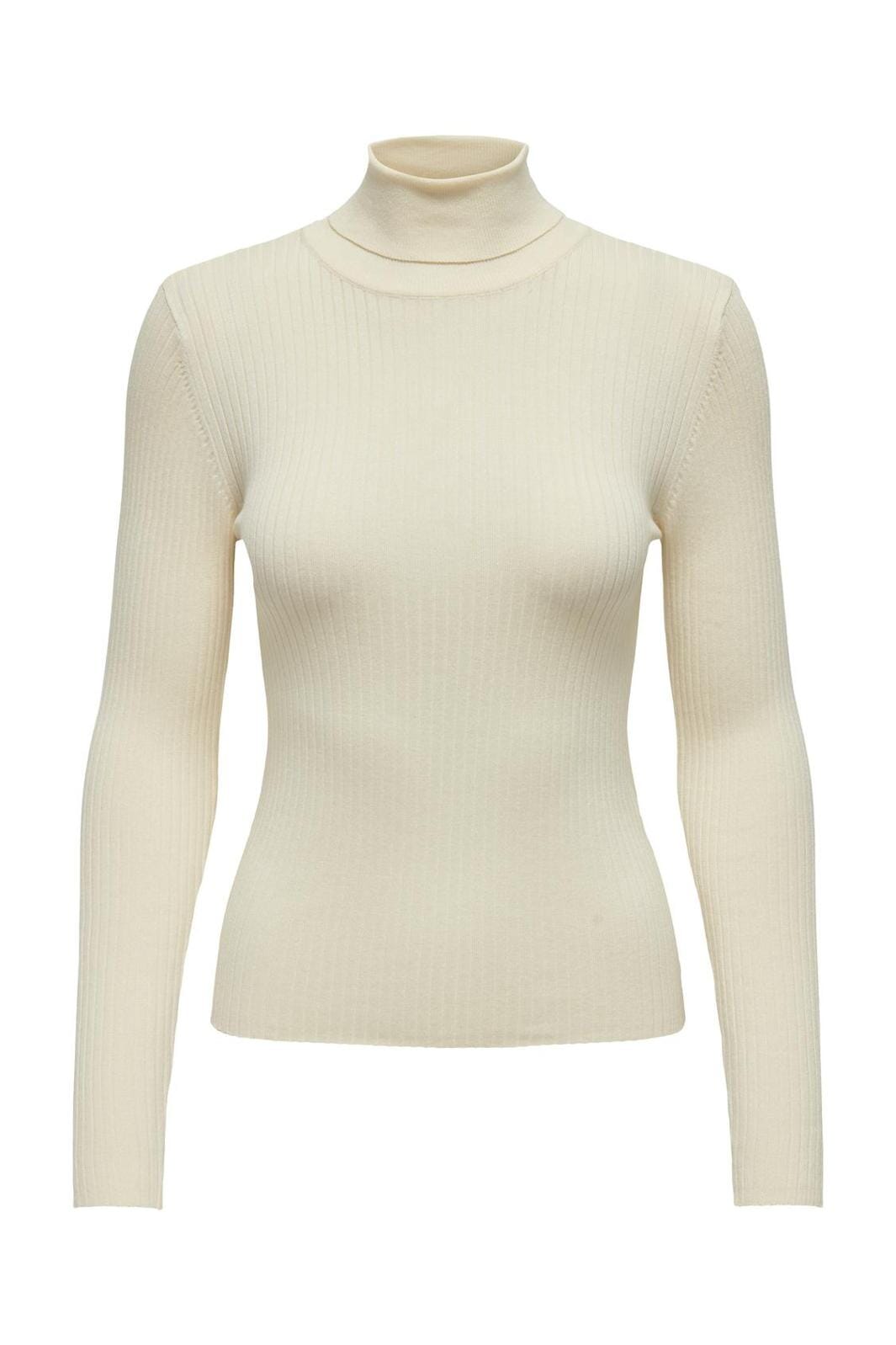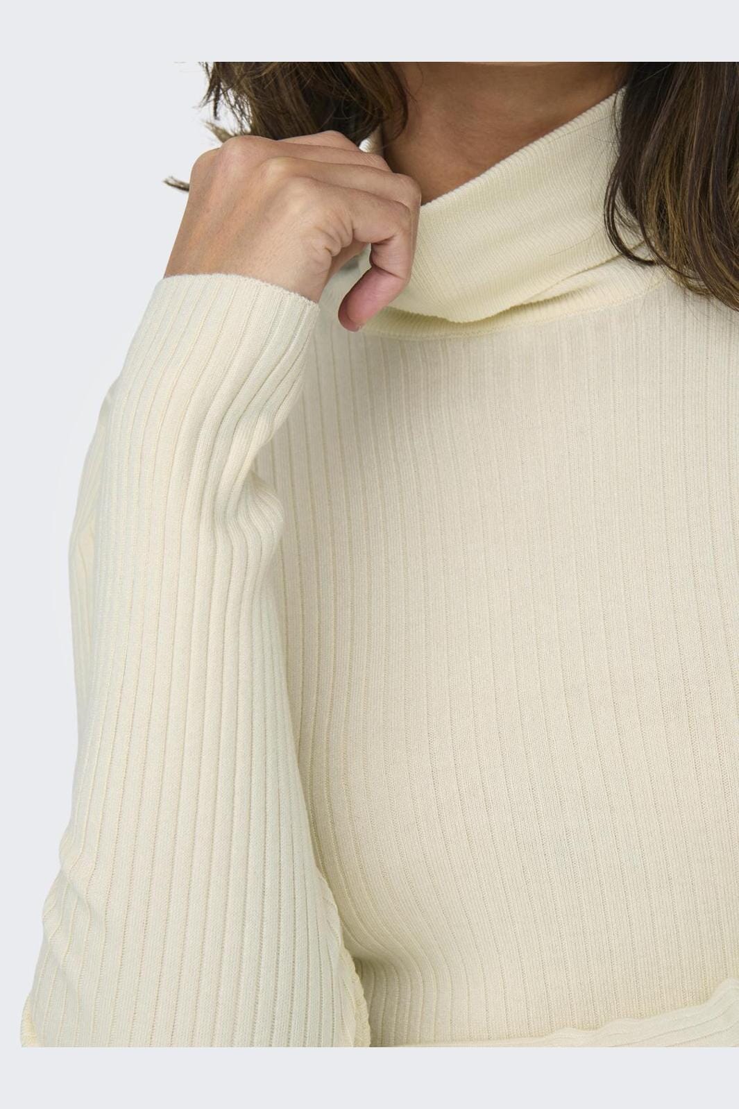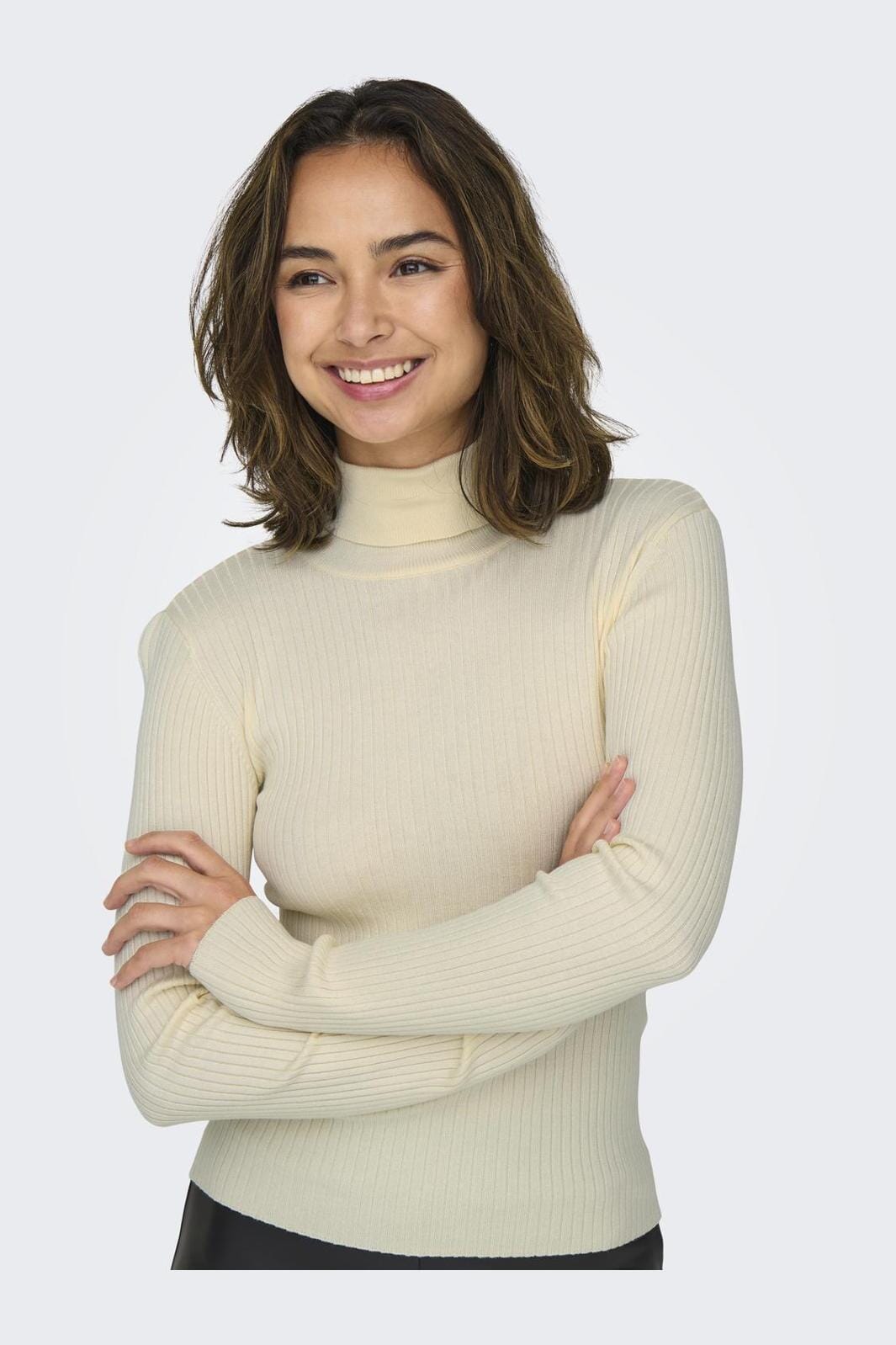 JDY:n rullakauluspaita vaaleassa kermavärissä. Ribattu neulepaita on tiukasti istuva, jossa on pitkät hihat ja korkea kaulus.