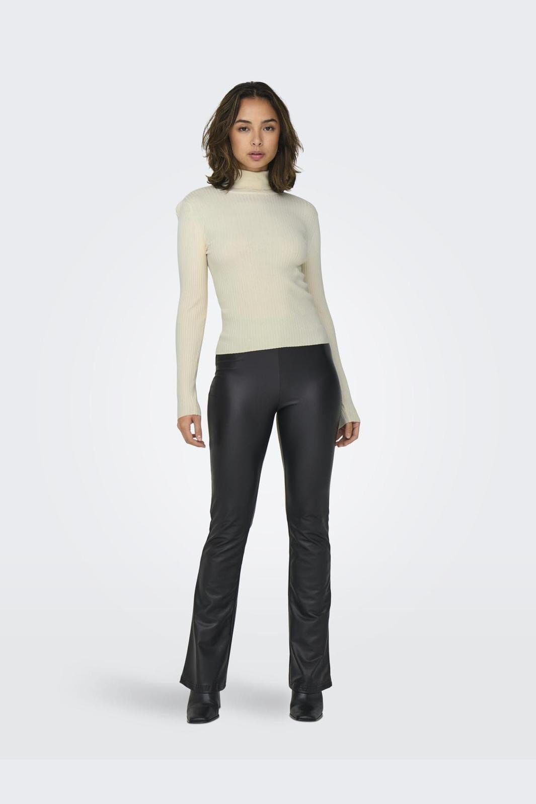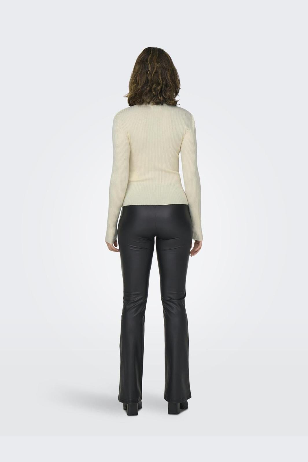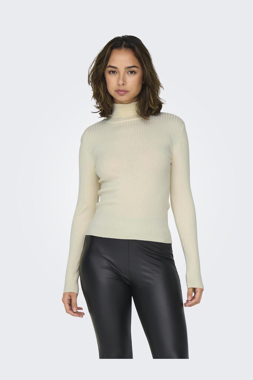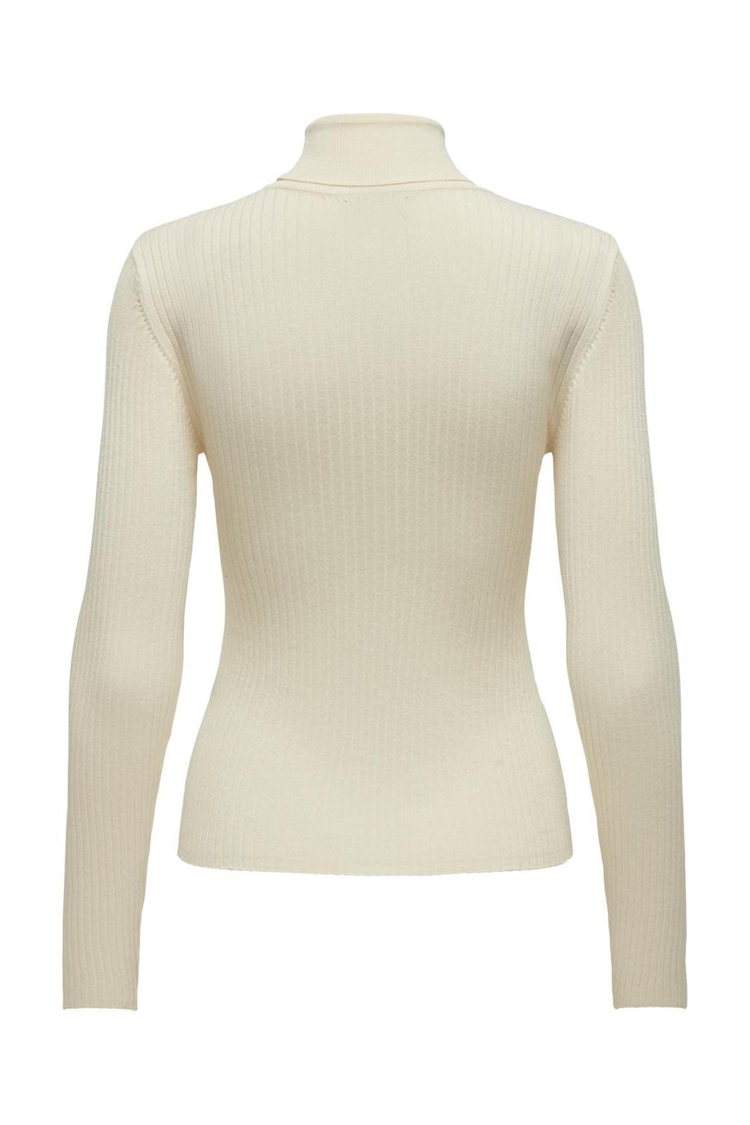 JDY:n rullakauluspaita vaaleassa kermavärissä. Ribattu neulepaita on tiukasti istuva, jossa on pitkät hihat ja korkea kaulus.