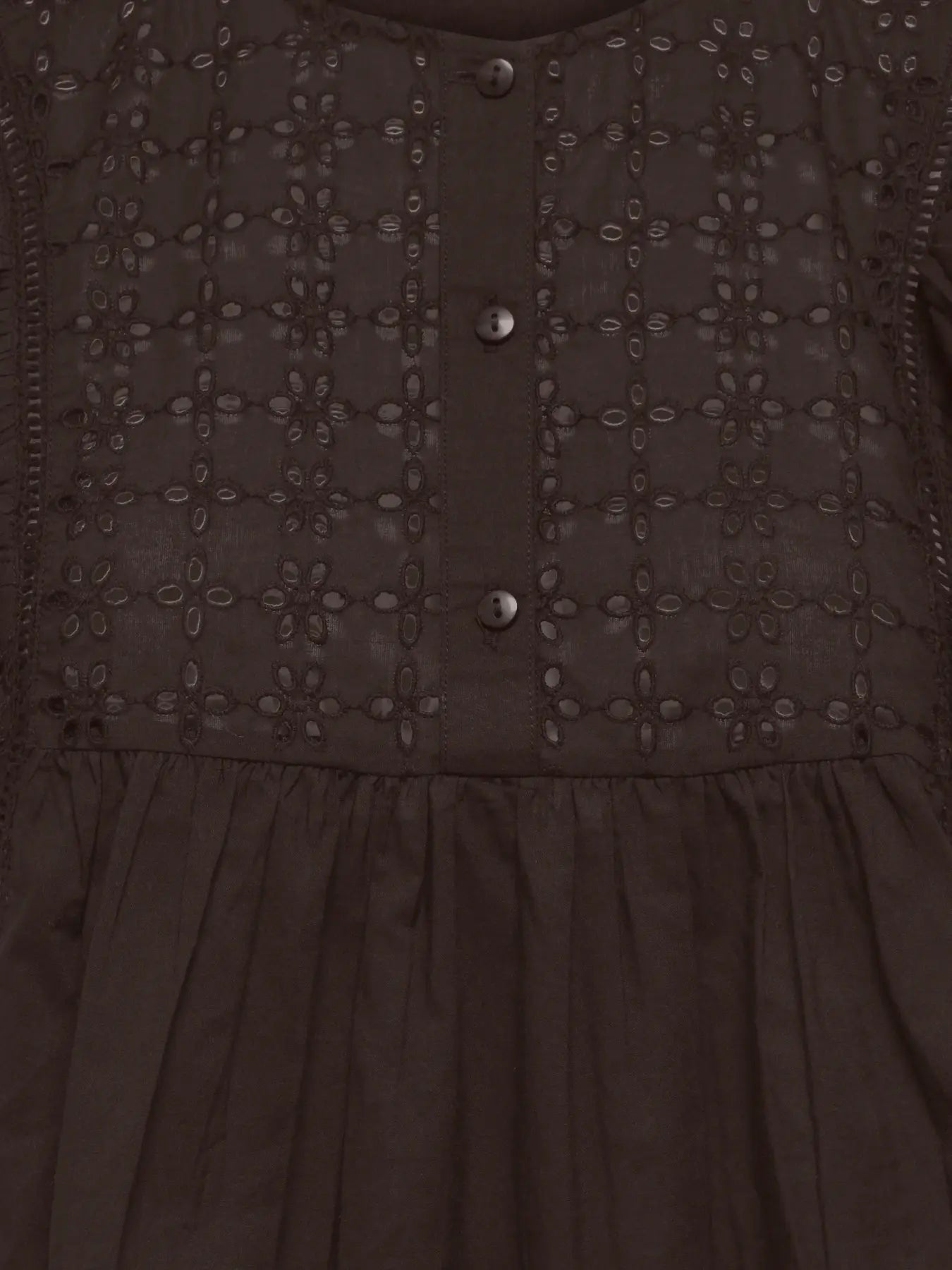 Ruskea toppi JDY:ltä, valmistettu 100 % puuvillasta. Topissa on koristeellisia ompeleita ja kirjailuja, jotka antavat sille yksityiskohtaisen ilmeen.