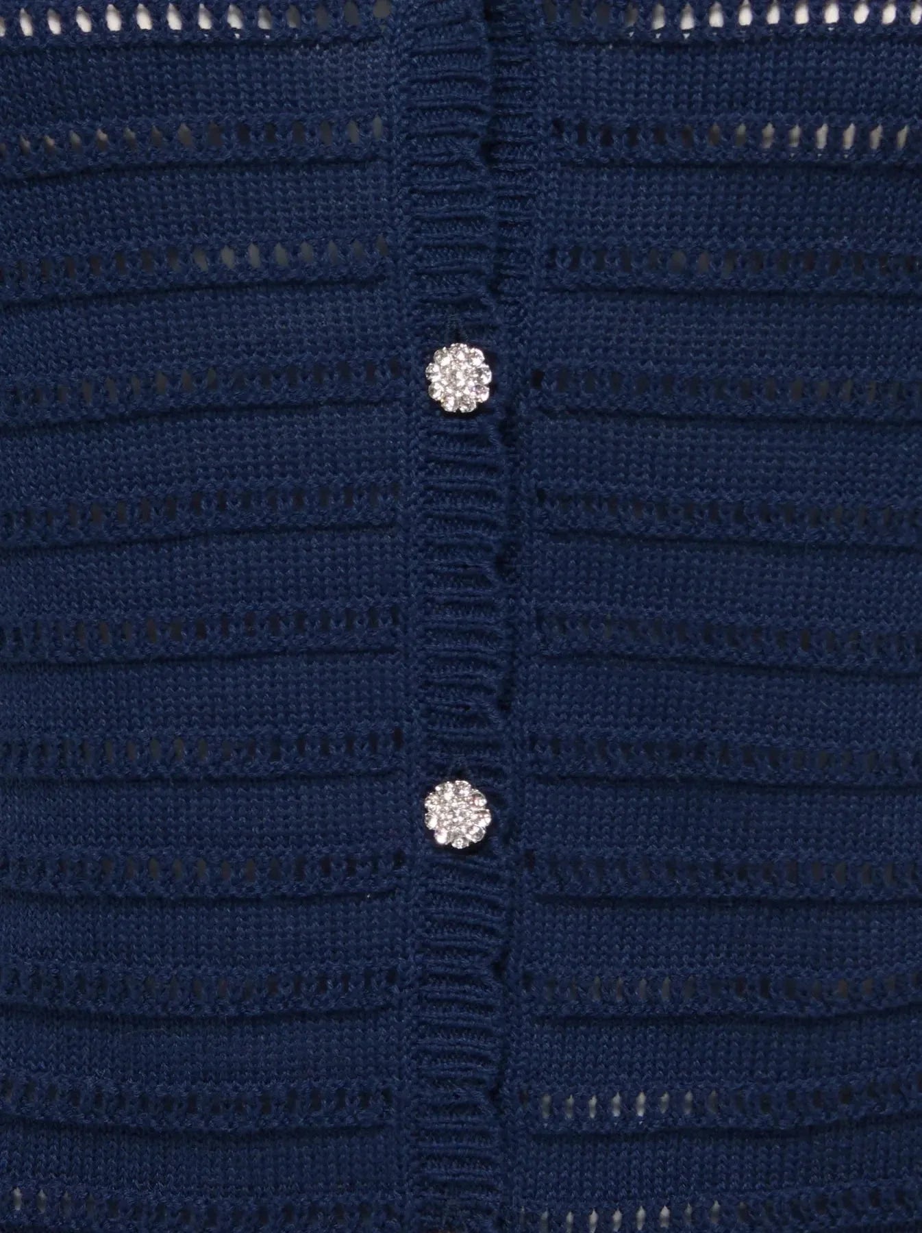 Tummansininen neuletakki JDY:ltä, jossa on avoin neulekuvio ja lyhyet hihat. V-pääntie ja kimaltelevat napit antavat neuletakille feminiinisen ilmeen.