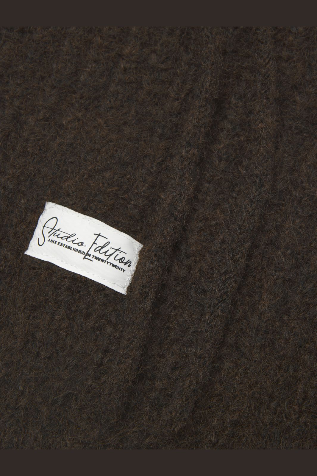 JJXX:n ruskea balaclava tasoneuleesta, jossa on nauhakiinnitys. Siinä on merkkiyksityiskohta ja se on valmistettu kierrätetyn polyesterin ja villan sekoituksesta, joka tarjoaa lämpöä kylminä päivinä.