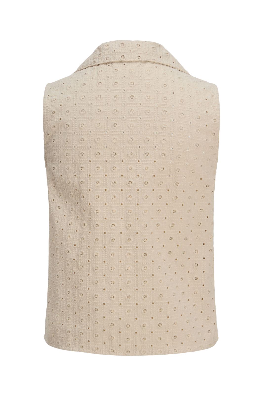 Hihaton toppi Jjxx:ltä vaaleassa kermansävyssä. Topissa on broderie anglaise -kuvio, jossa on pieniä kukkia ja reikiä, edessä vetoketjukiinnitys ja klassinen kauluspaita-kaulus.