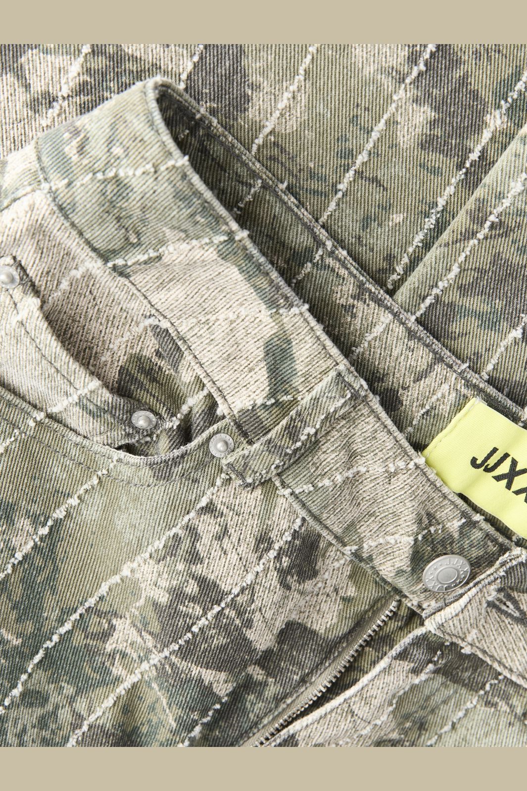 Leveät housut Jjxx:ltä khakinvihreässä sävyssä, jossa on camokuosi ja ohuet liituraitakuviot. Housut on valmistettu kudotusta puuvillakankaasta.