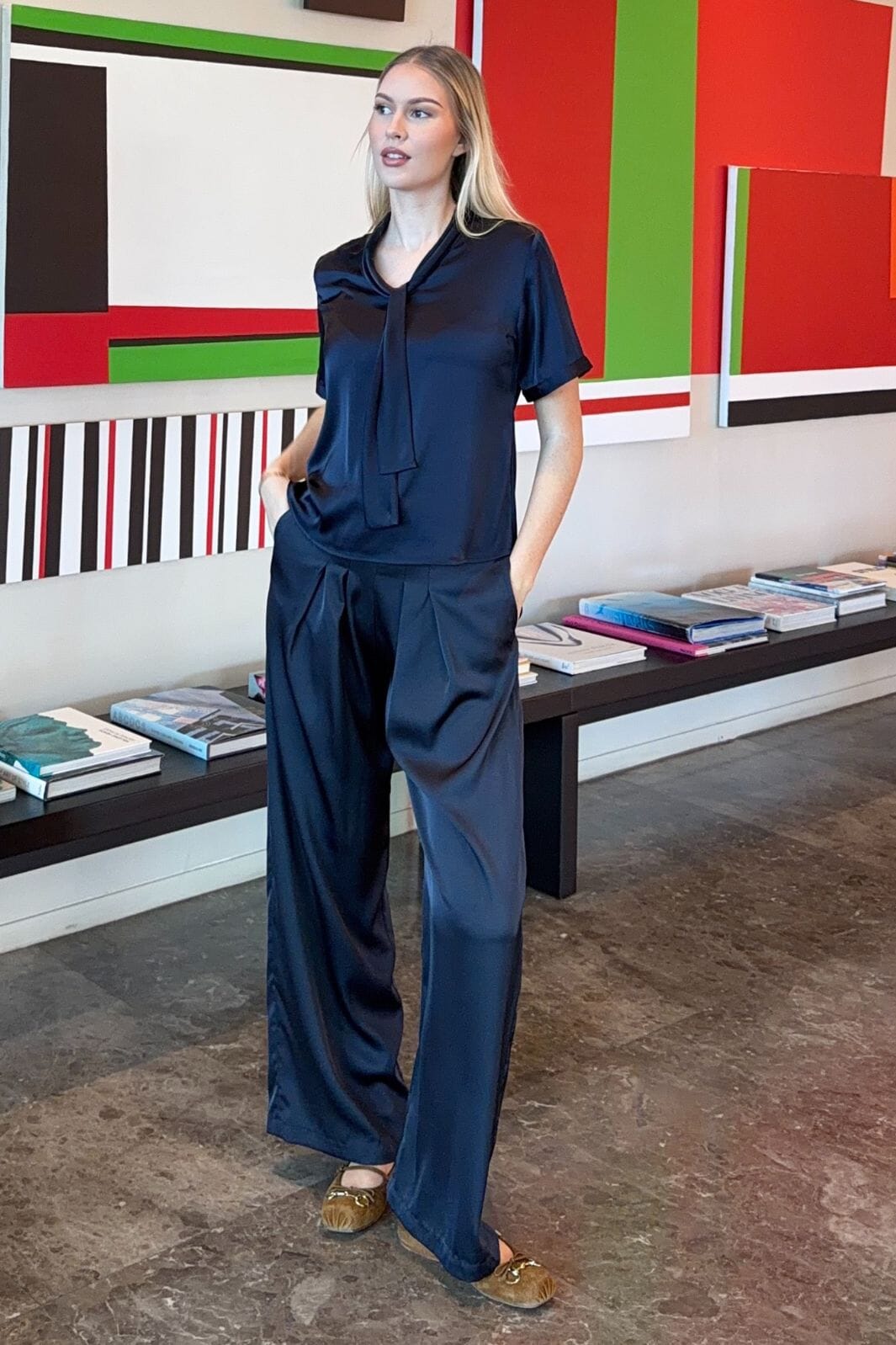 Tummansiniset housut Karmamialta, joissa on korkea vyötärö ja leveät lahkeet. Housut sopivat sekä juhlaan, arkeen että muodollisiin tilaisuuksiin.
