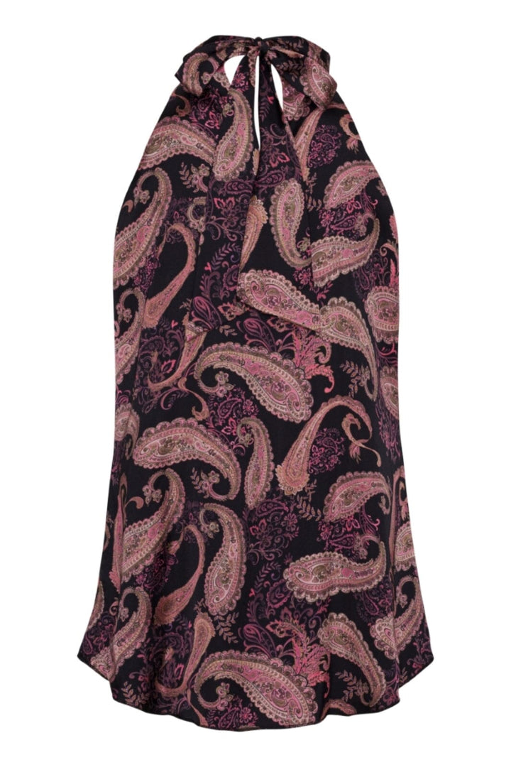 Karmamian korkeakauluksinen toppi, jossa on paisley-kuvio pinkin sävyissä mustalla taustalla. Topissa on halterneck-muotoilu korkealla kauluksella ja sidontanauhat niskassa.