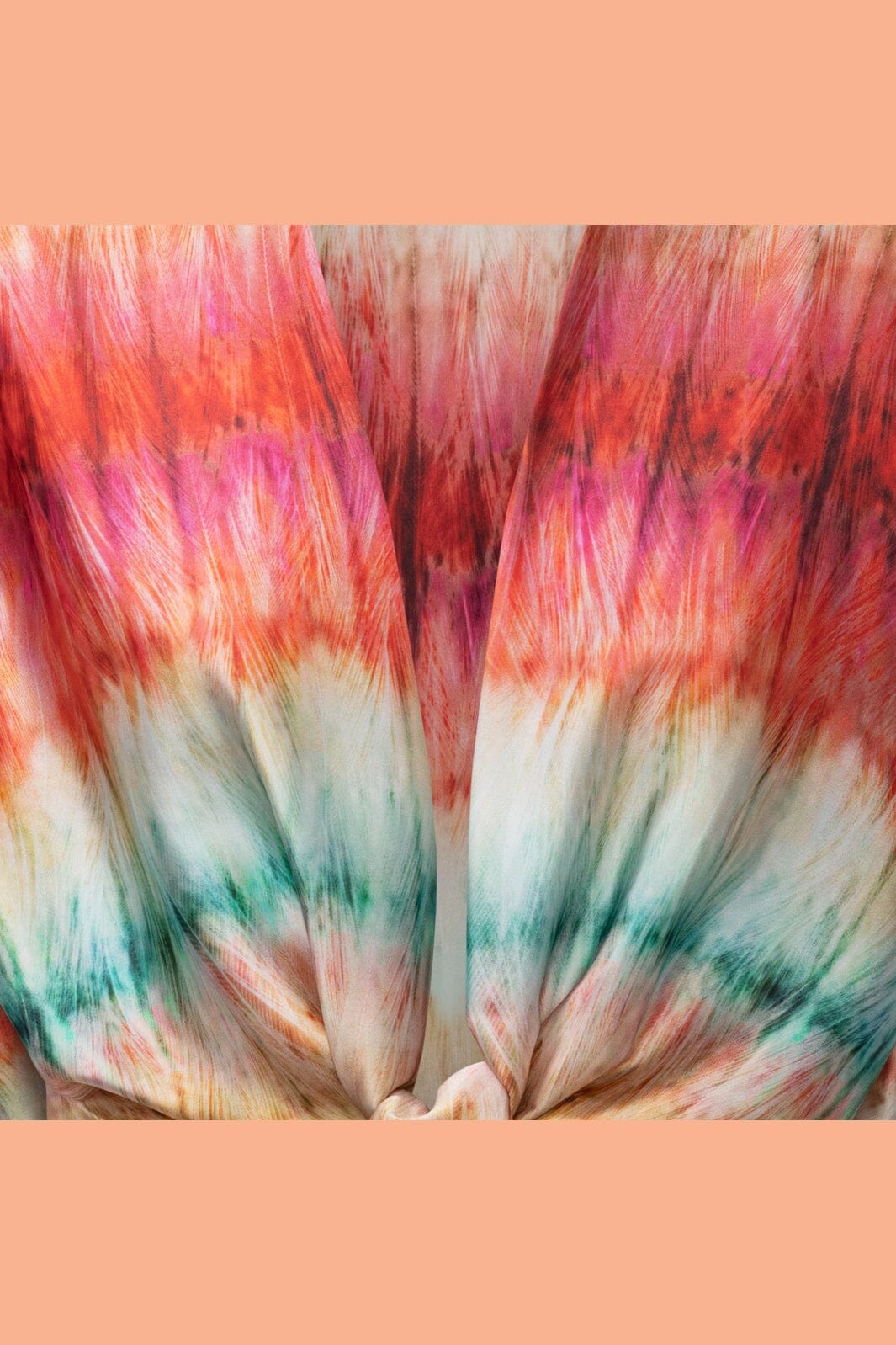 Karmamian kimono, jossa on monivärinen kuvio punaisen, vaaleanpunaisen, vihreän ja valkoisen sävyissä. Raidoissa on liukuväriefekti, joka kulkee punaisista sävyistä vihreisiin.