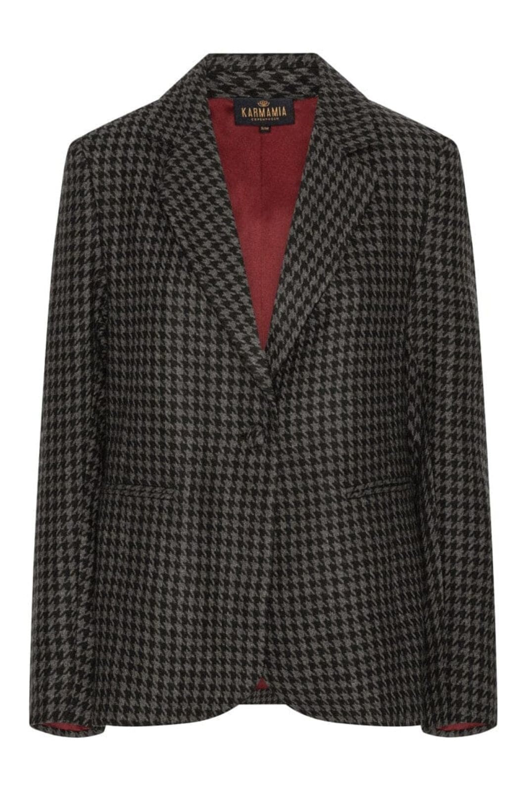 Karmamian bleiseri mustavalkoisella houndstooth-kuviolla. Siinä on oversized-mitoitus, kauluspaita, käytännölliset taskut ja punainen sisävuori.
