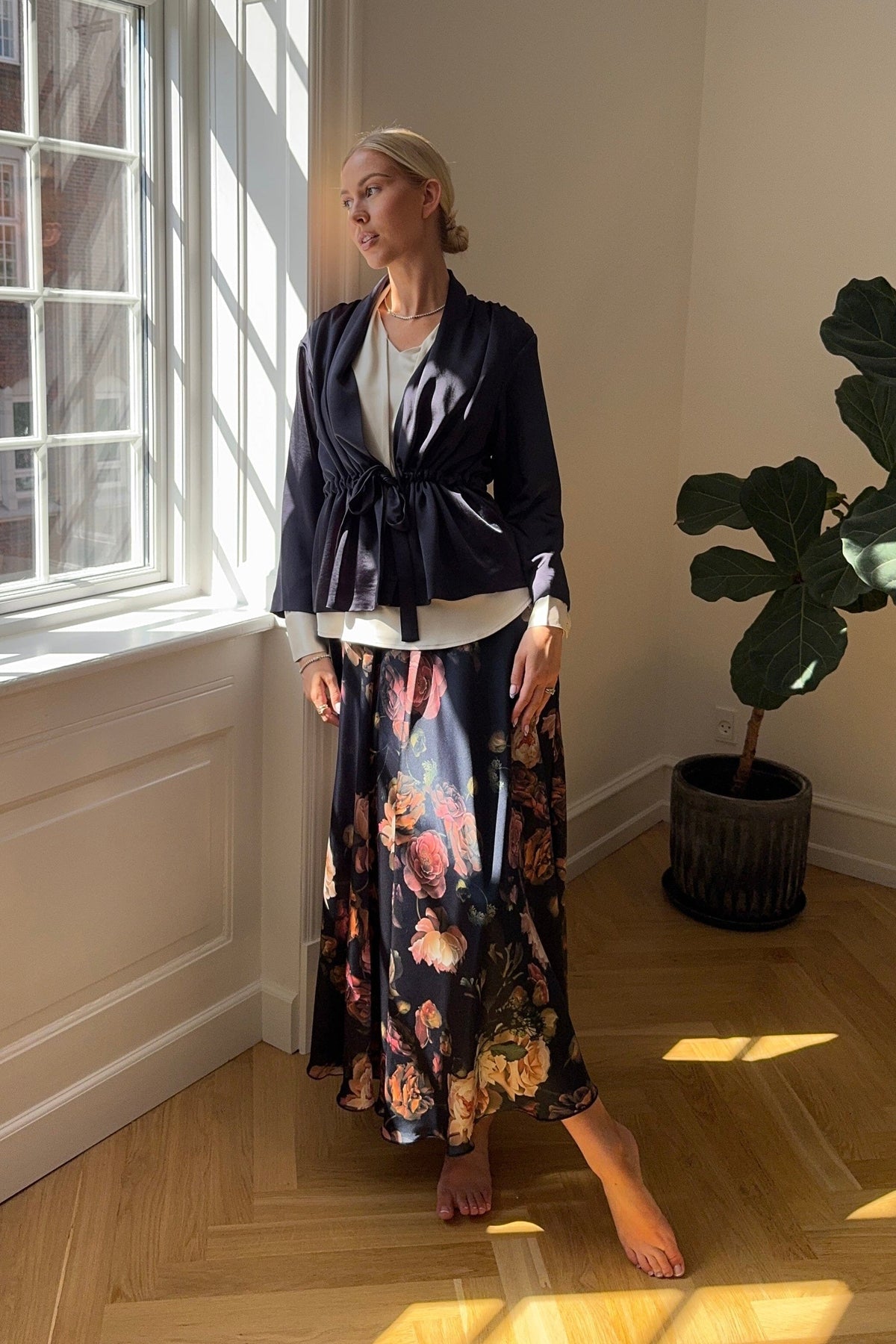 Musta hame Karmamialta kukkakuviolla vaaleanpunaisissa, persikan ja kerman sävyissä. Siinä on korkea vyötärö ja se ulottuu polven keskelle. Kangas laskeutuu pehmeästi ja siinä on sileä pinta.