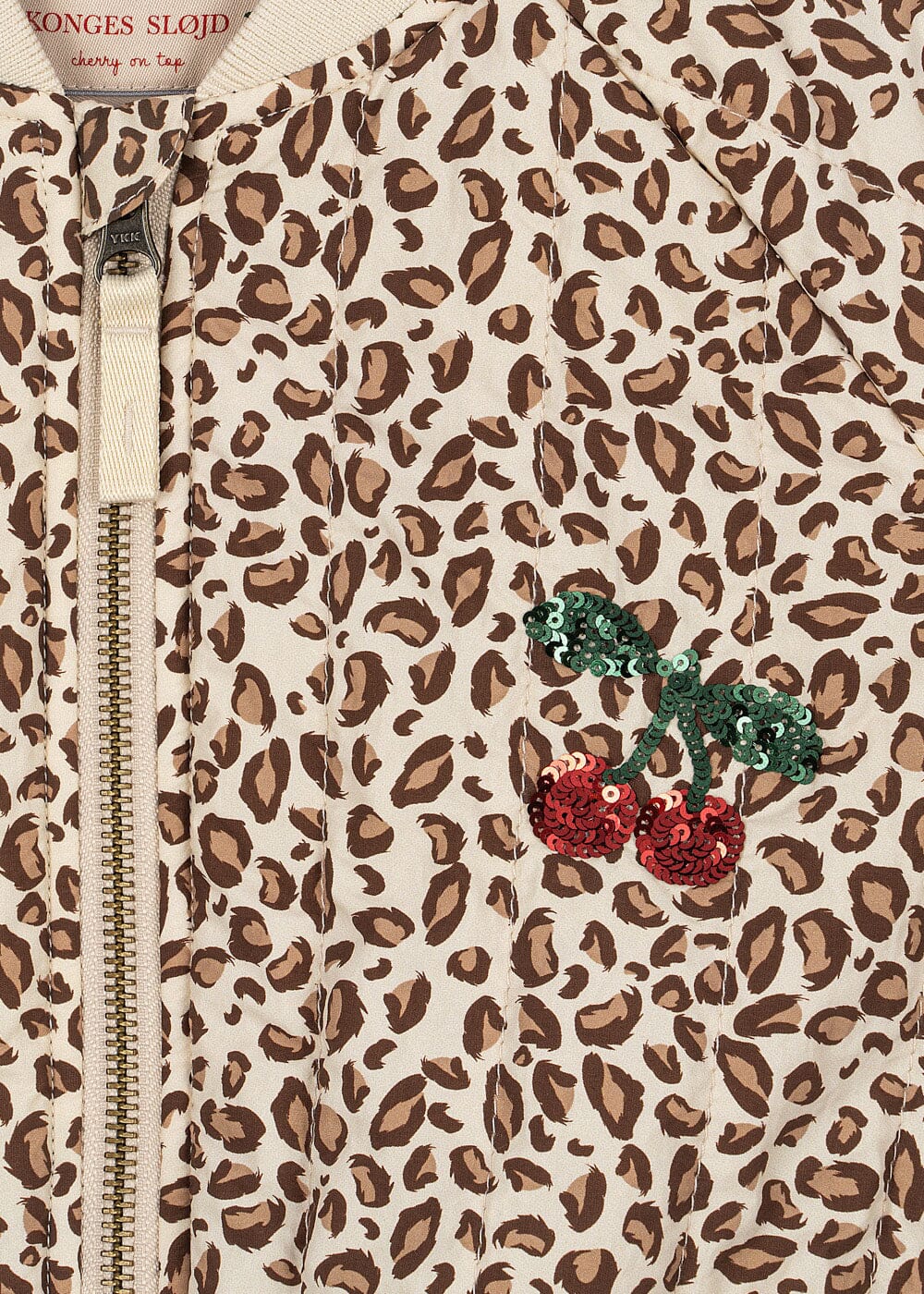 Konges Sløjd -merkin bombertakki, jossa leopardikuvio beigen, ruskean, vihreän ja punaisen sävyissä kautta koko takin.