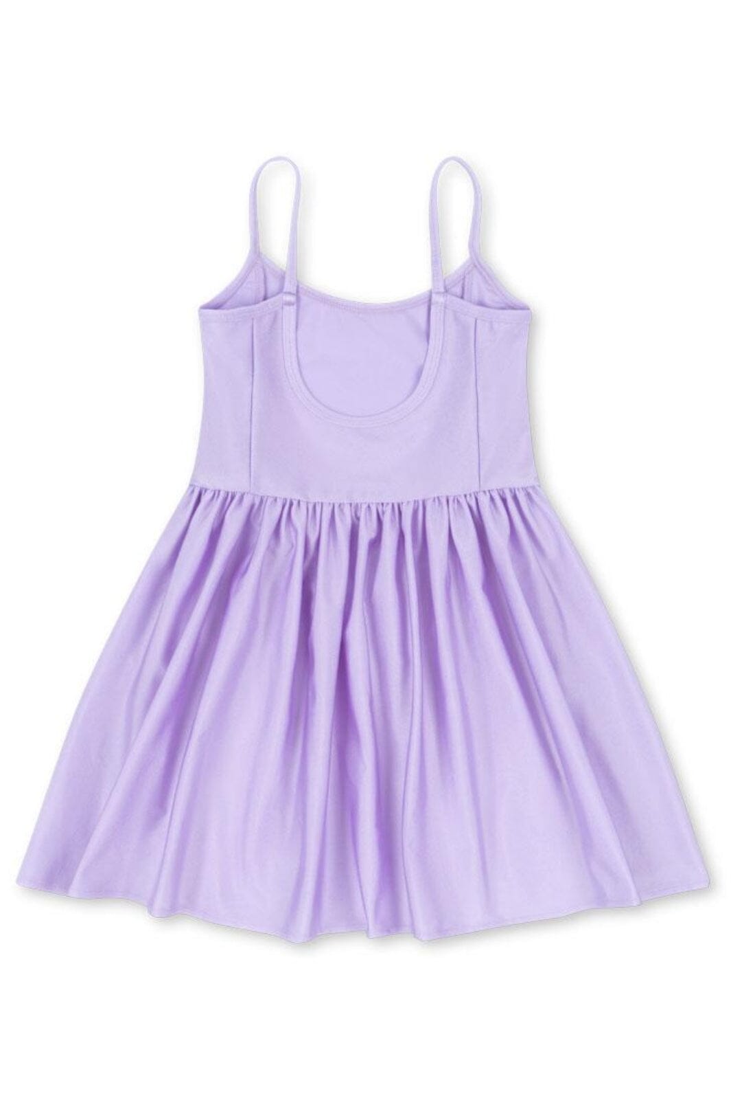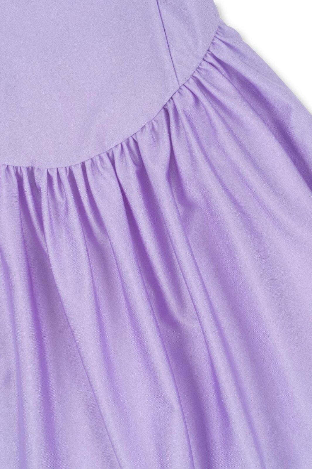 Laventelinvärinen mekko Konges Sløjdilta, jossa on laskostettu hame ja ohuet olkaimet. Mekossa on pyöreä kaula-aukko ja pieni ruusu koristeena edessä.