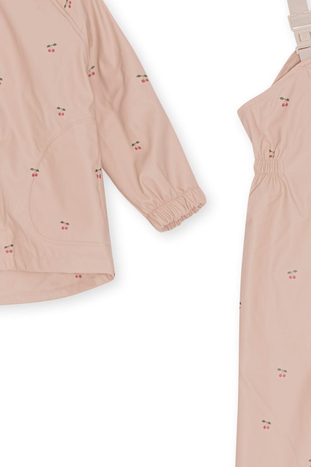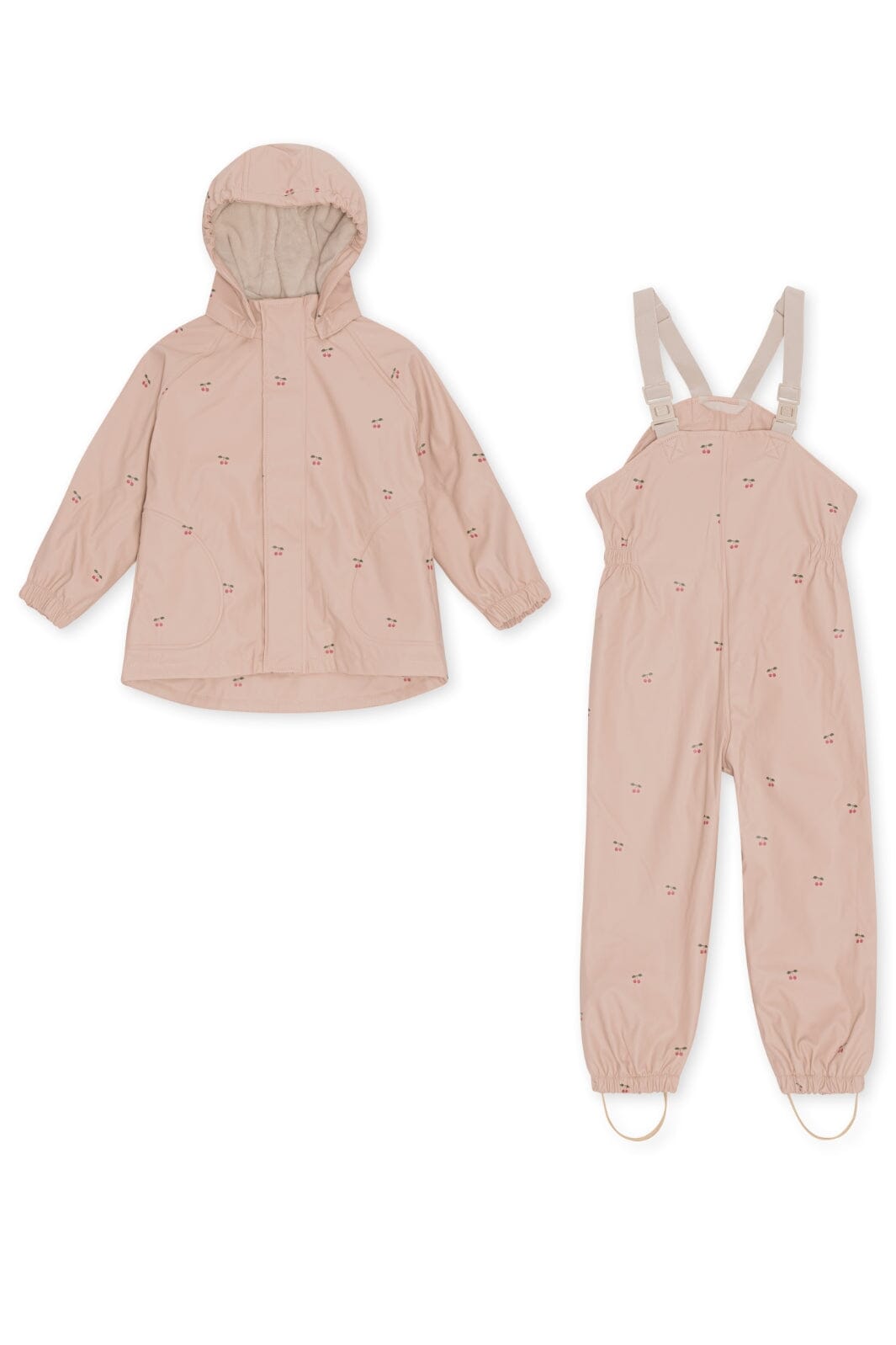 Konges Sløjd:n sadekamppe, jossa on kirsikkakuosi vaaleanpunaisissa ja punaisissa sävyissä. Setti koostuu hupullisesta takista ja haalareista, joissa on olkaimet.