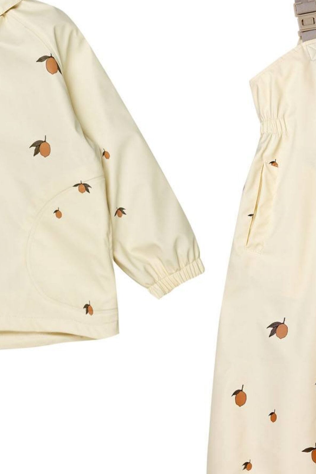 Konges Sløjd:n sadeasu kermaisessa sävyssä sitruunaprintillä. Setti koostuu hupullisesta takista ja säädettävillä olkaimilla varustetuista haalareista.