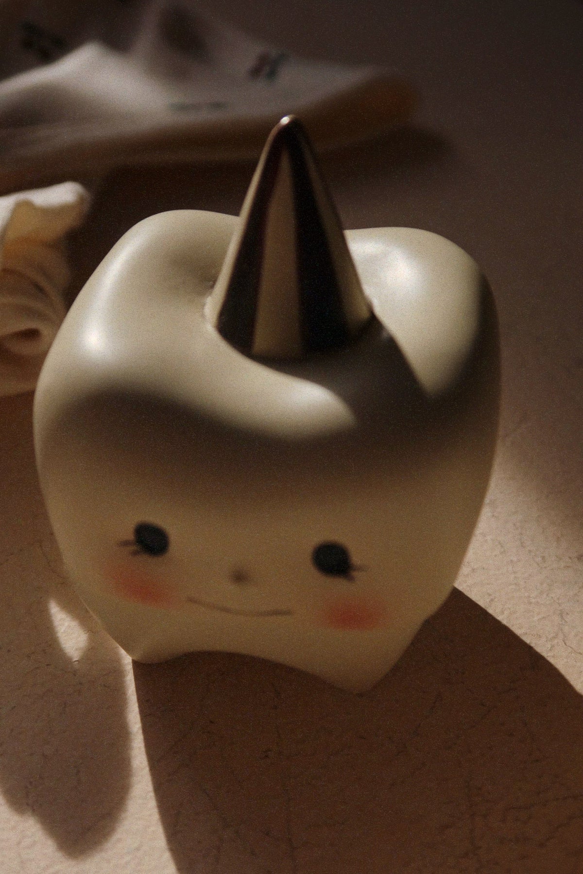 Konges Sløjd:n hammasmuotoisessa säilytyslaatikkossa on koristeellisia yksityiskohtia. Laatikko on muotoiltu hampaan muotoon ja siinä on kasvot edessä.