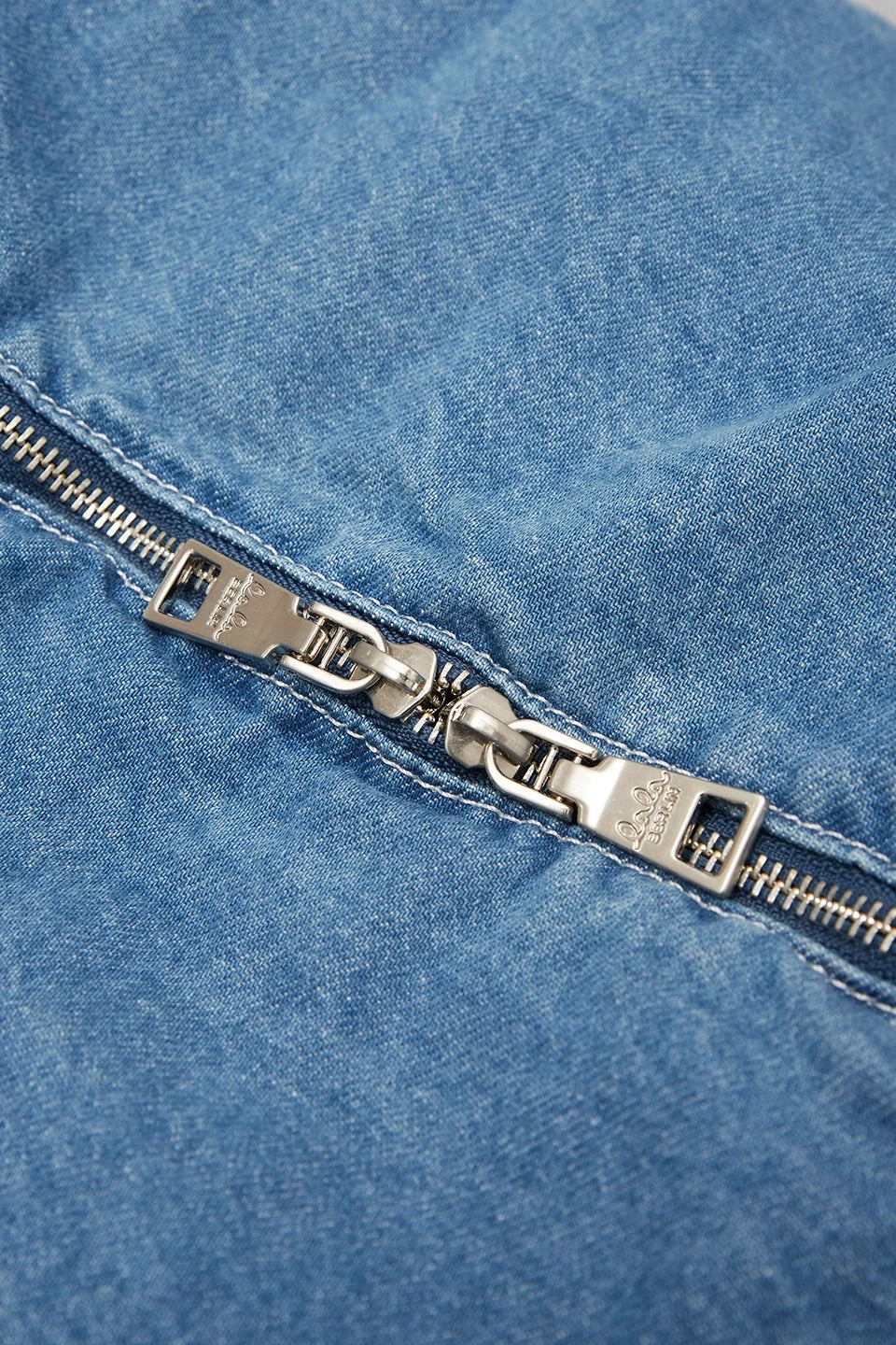Suuri Lala Berlin -laukku, joka on valmistettu denimistä pestyn sinisen sävyisenä. Laukussa on suorakulmainen muoto ja pitkät kantokahvat.