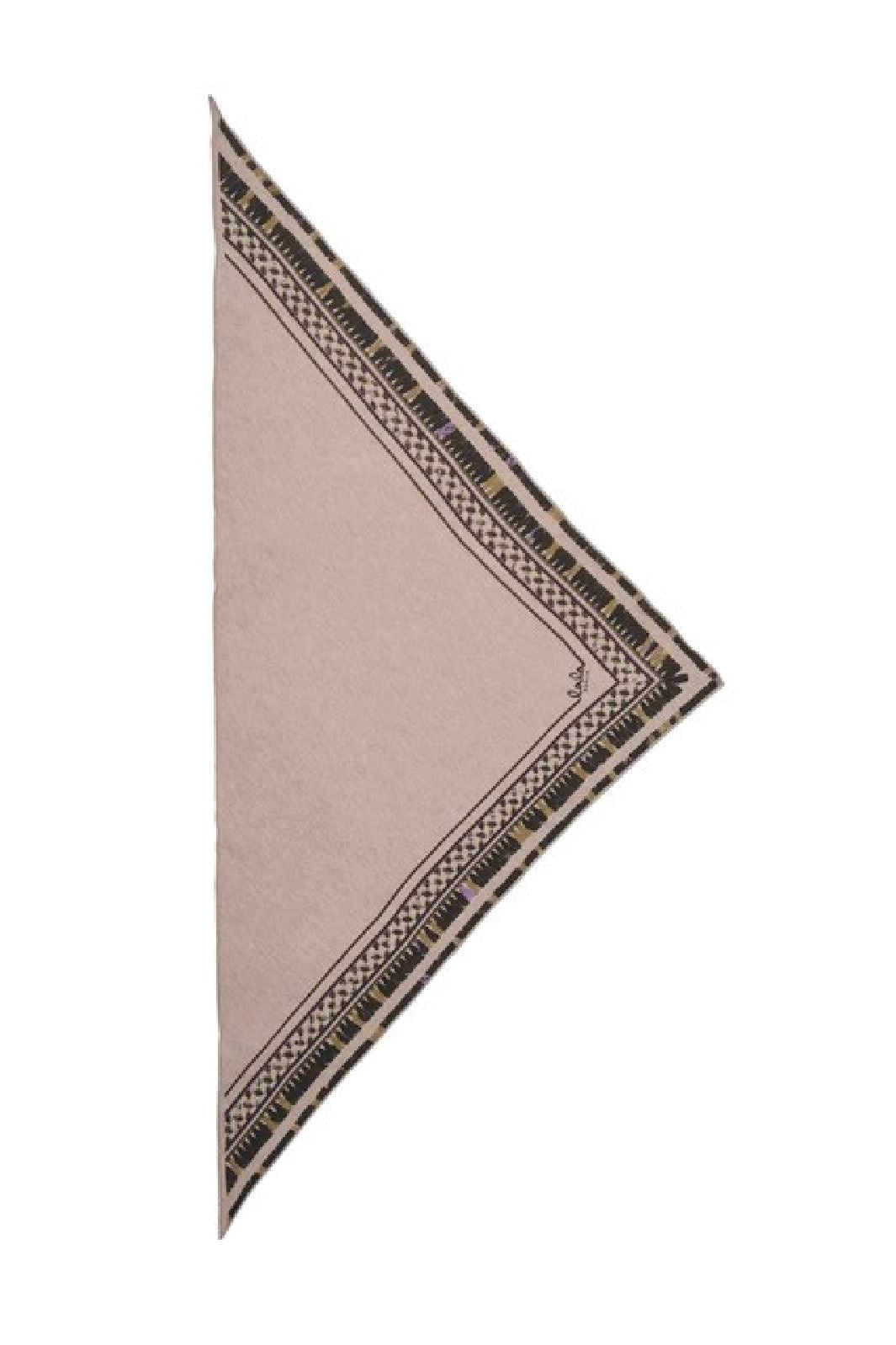 Kolmion muotoinen huivi Lala Berliniltä beigenä. Huivi on valmistettu kashmirista, ja siinä on tyypillinen kufiya-kuvio sekä koristeelliset hapsut reunoilla.