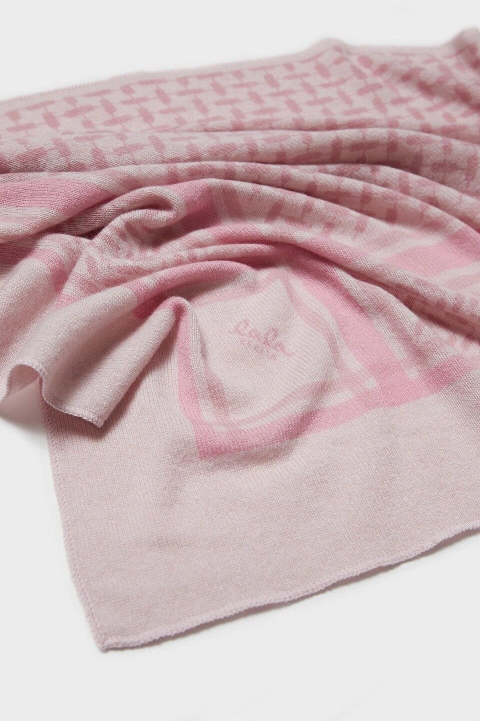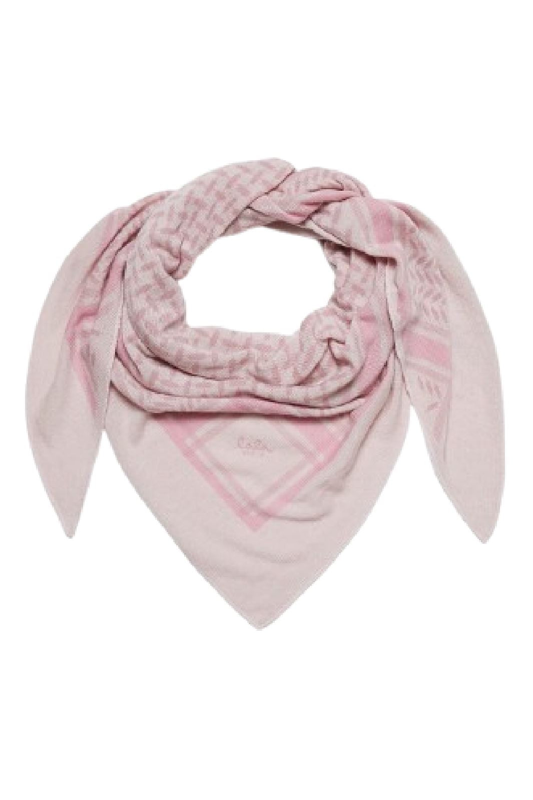 Kolmion muotoinen huivi Lala Berliniltä kashmirista, jossa on tunnusomainen kuvio. Huivissa on pehmeä rakenne ja se on saatavana vaaleanpunaisena, jossa on brändin tunnettu printti.