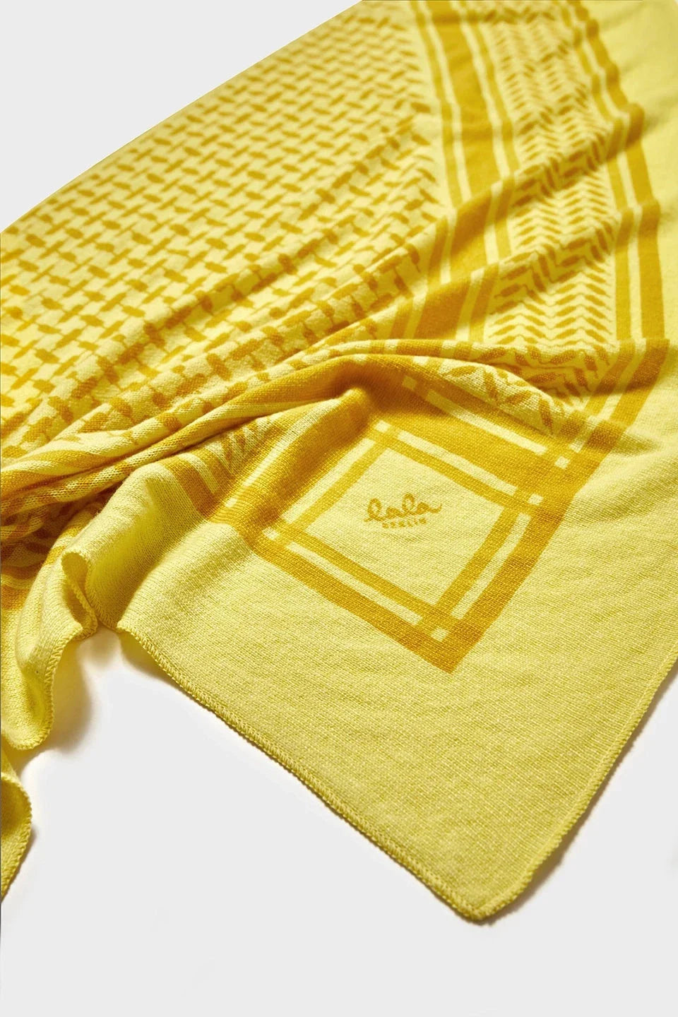 Kolmionmuotoinen huivi Lala Berliniltä, valmistettu kashmirista vaaleankeltaisessa sävyssä. Huivissa on geometrinen kuvio ja kankaaseen painettu brändin nimi.