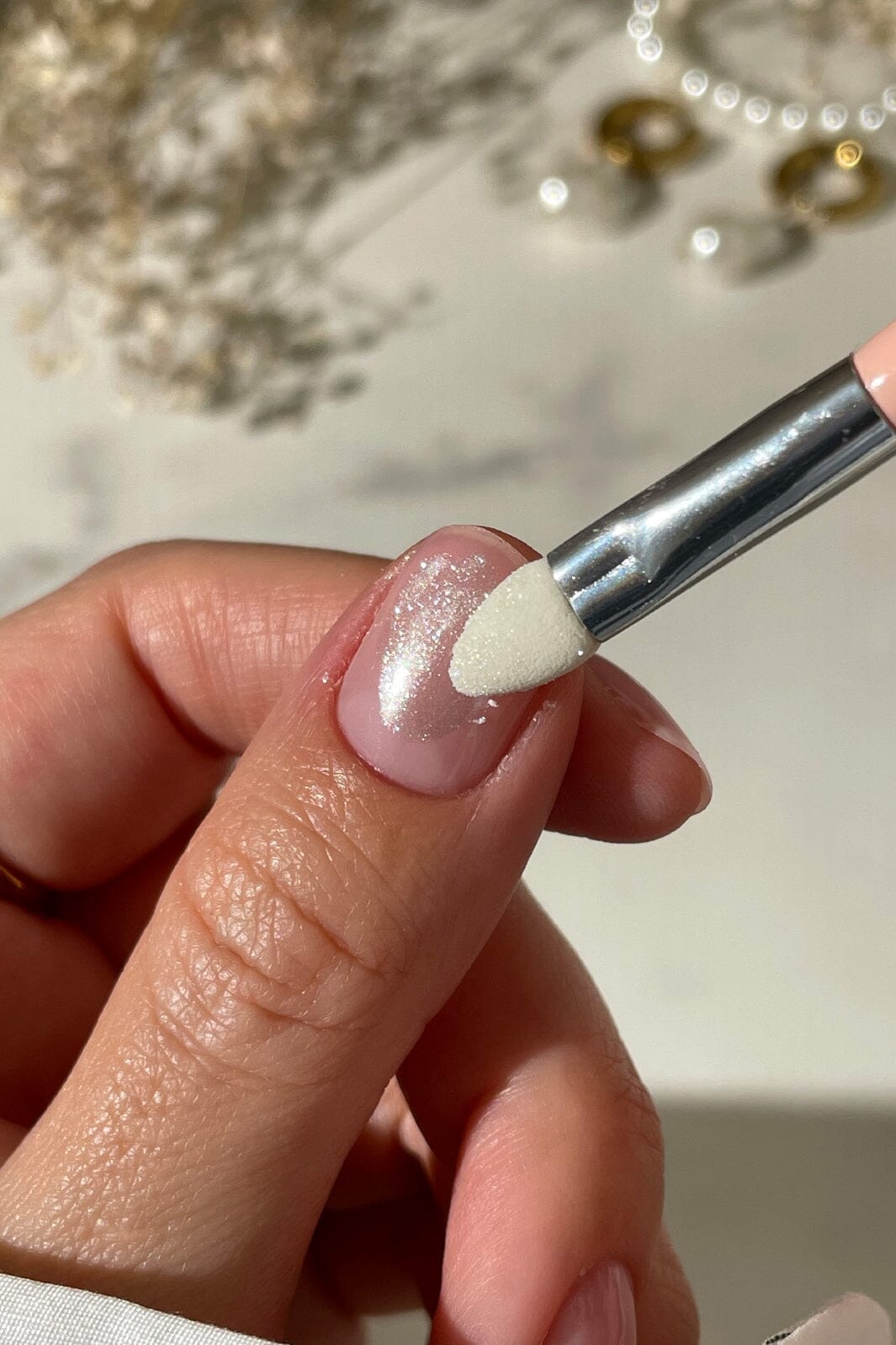 Aloita levittämällä valkoista Milkshake-geellakkaa pohjana. Koveta lakka UV-lampussa 15 sekuntia. Levitä sitten kromijauhe mukana tulevalla applikaattorilla. Taputtele jauhe varovasti kovetettuun pohjaan, kunnes helmiäisvaikutus ilmenee. Lopeta 1-2 kerroksella päällyslakkaa ja koveta uudelleen suojataksesi viimeistelyä.