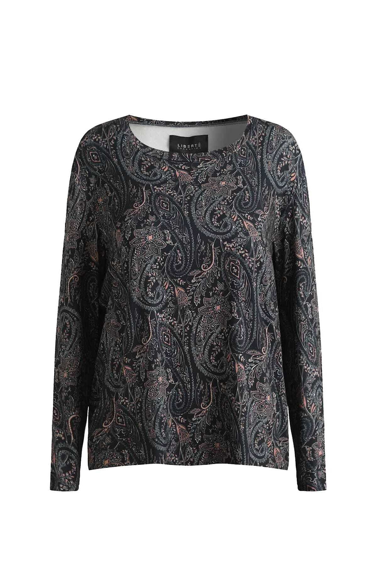 Pitkähihaisen Liberte-T-paidan paisley-kuvio on vaaleissa sävyissä tummansinisellä taustalla. T-paidassa on pyöreä pääntie ja se on tarkoitettu rennon vapaa-ajan käyttöön.