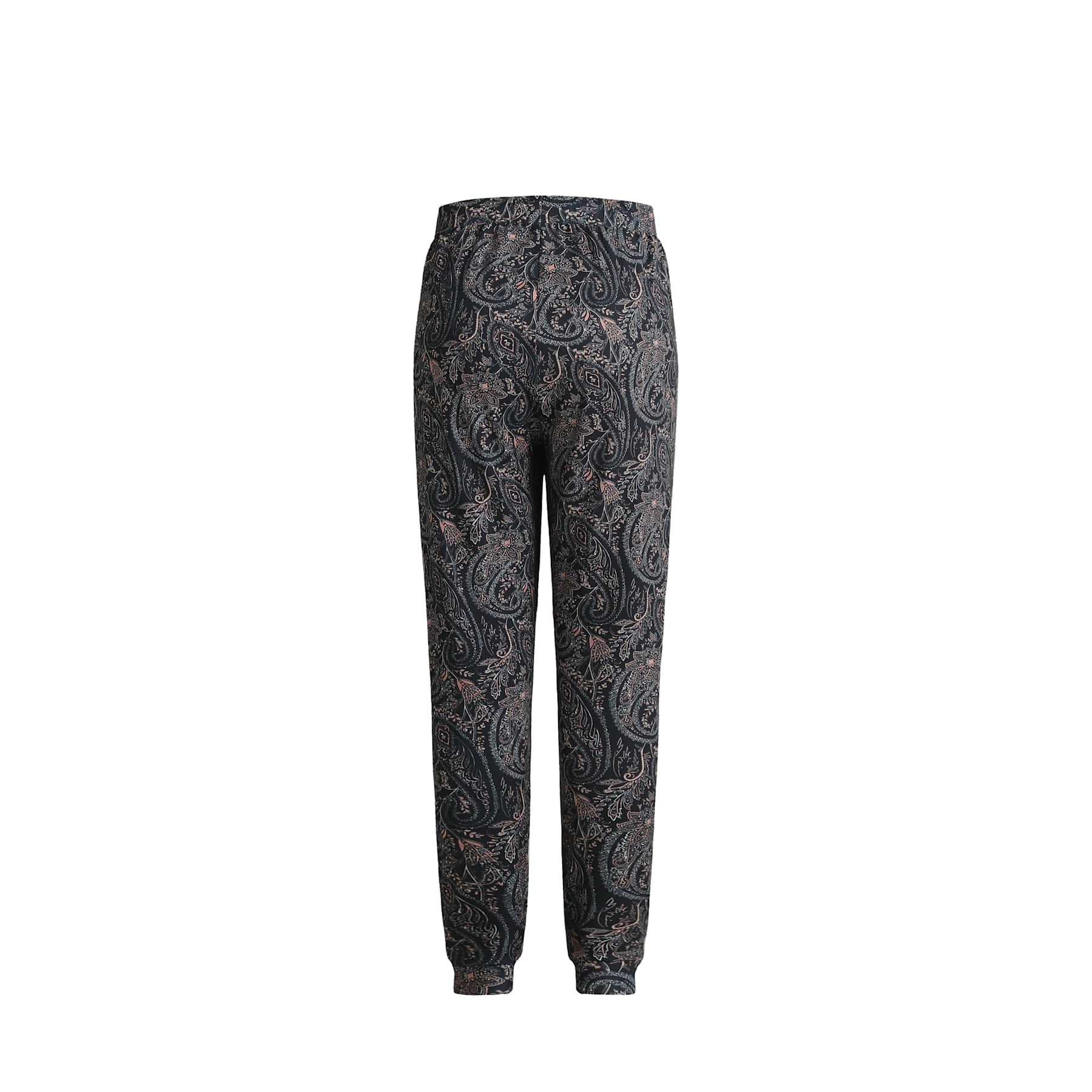 Liberte-housut tummansinisellä paisley-kuviolla. Valmistettu 90 % polyesteristä ja 10 % elastaanista pehmeyden ja joustavuuden takaamiseksi.