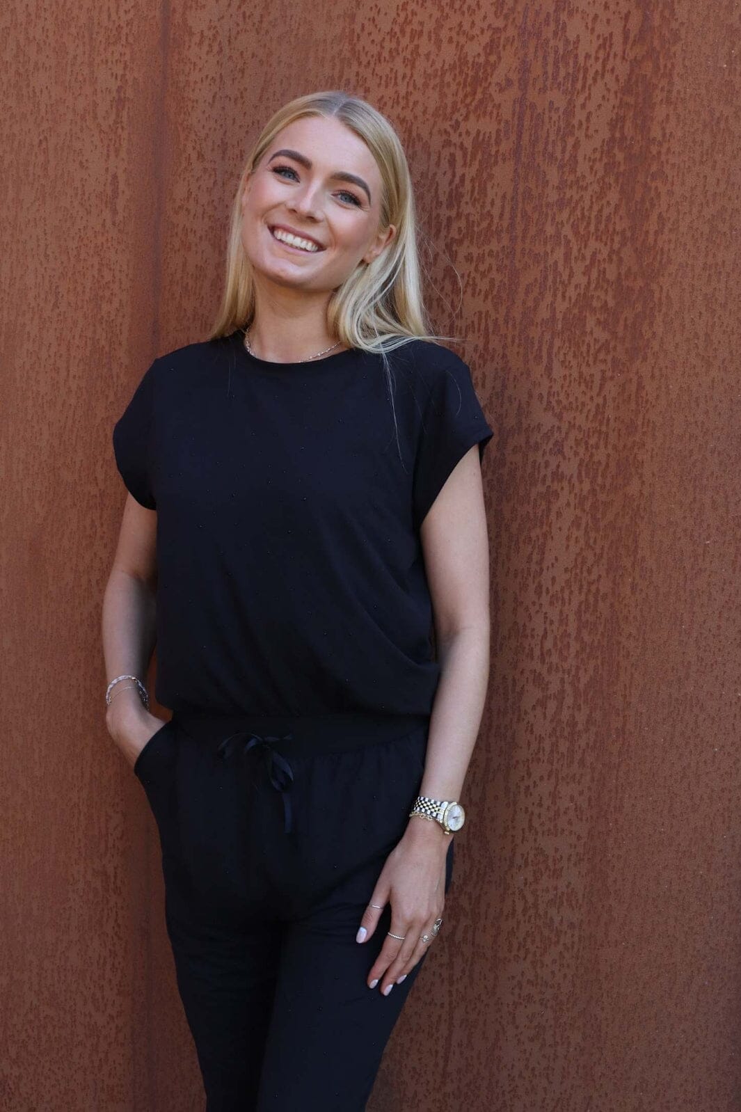 Musta Liberte T-paita paljeteilla. Musta väri tekee siitä helpon yhdistää muihin vaatekaapin osiin sekä arkeen että juhlavampiin tilaisuuksiin.