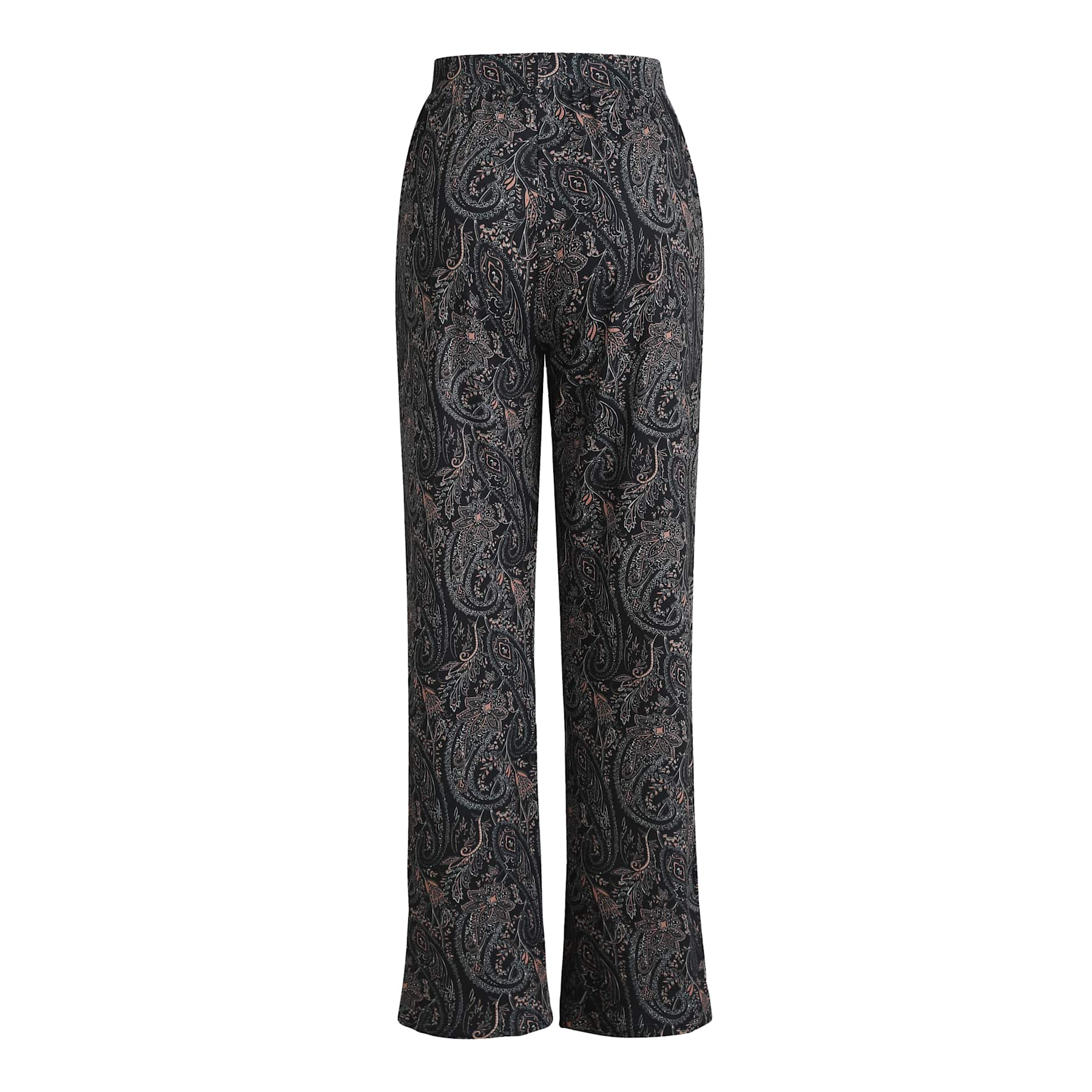 Väljät housut Liberteltä Alma-laadussa, joissa on paisley-kuvio tummansinisissä sävyissä. Housuissa on leveälahkeinen malli ja korkea vyötärö.