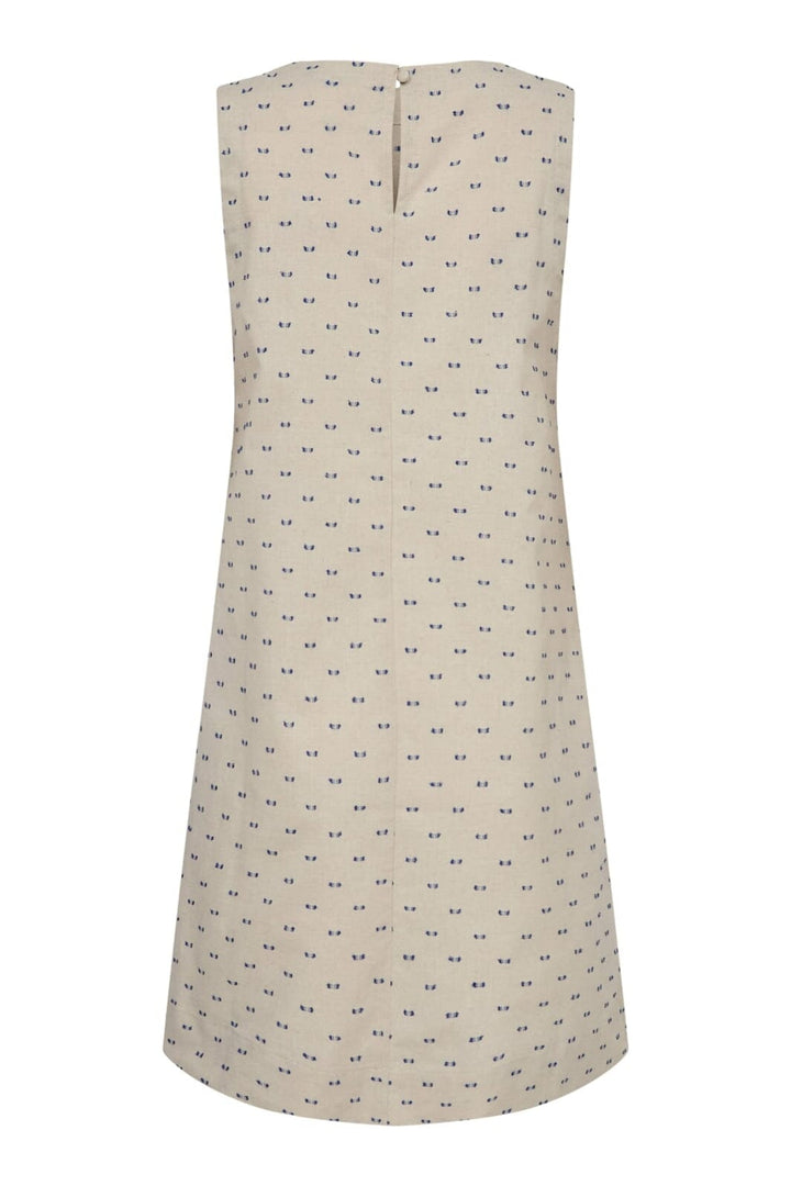 Olkaimeton mekko Liberte:ltä, jossa on sinisiä pisteitä vaalealla taustalla. Mekossa on pyöreä kaula-aukko ja suora leikkaus reisiin asti.