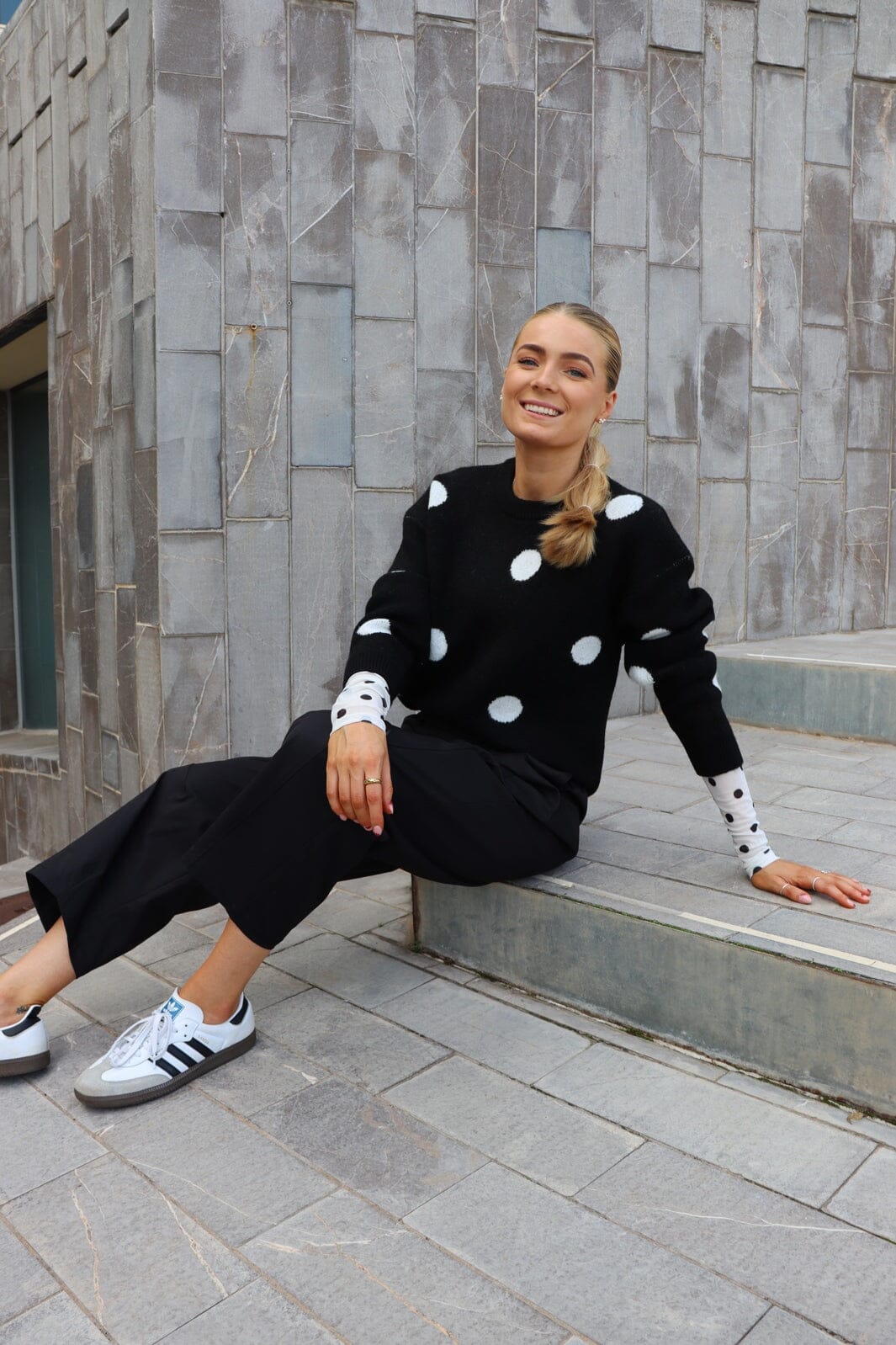 Musta neule Liberte:ltä valkoisilla pisteillä. Neuleessa on pyöreä kaula-aukko, pitkät hihat ja löysä istuvuus.