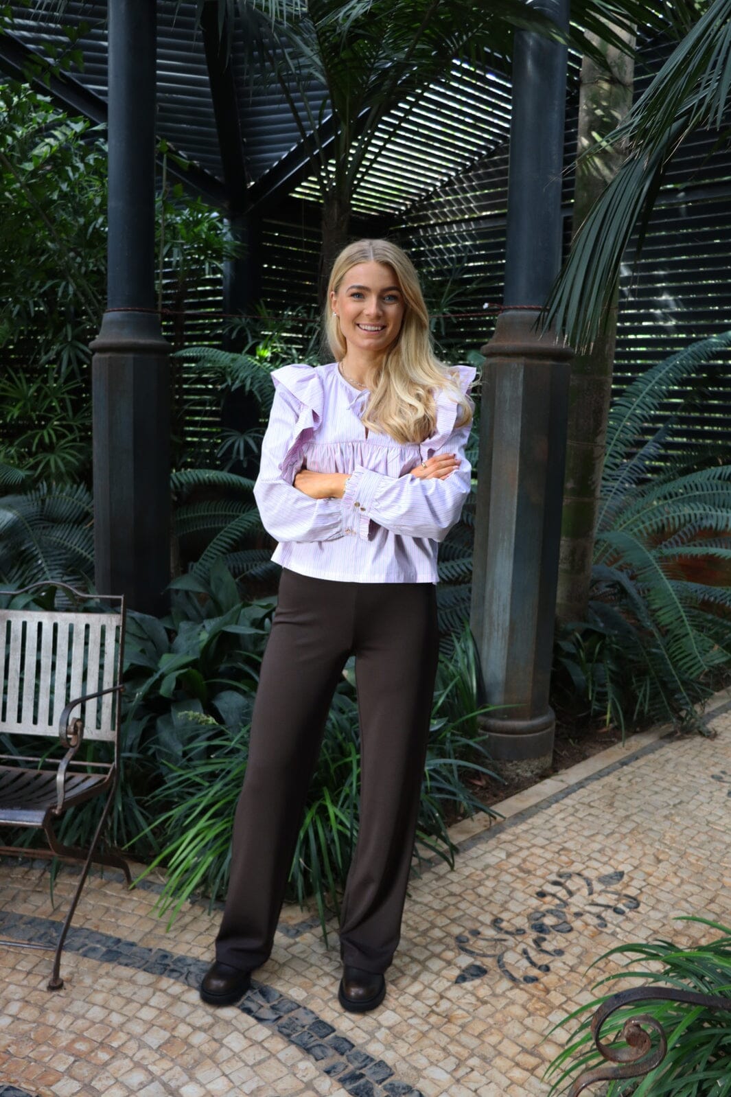 Vaaleanpunainen raidallinen paita Liberte:ltä, valmistettu 100 % puuvillasta. Paidassa on vaaleanpunainen ja valkoinen raidallinen kuvio, jossa on rypytyksiä olkapäissä.