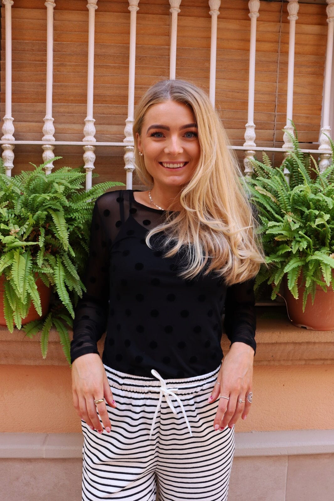 Musta pitkähihaisen mesh-paita Liberte:ltä suurilla mustilla pisteillä. Se sopii sekä arkeen että juhlatilaisuuksiin.